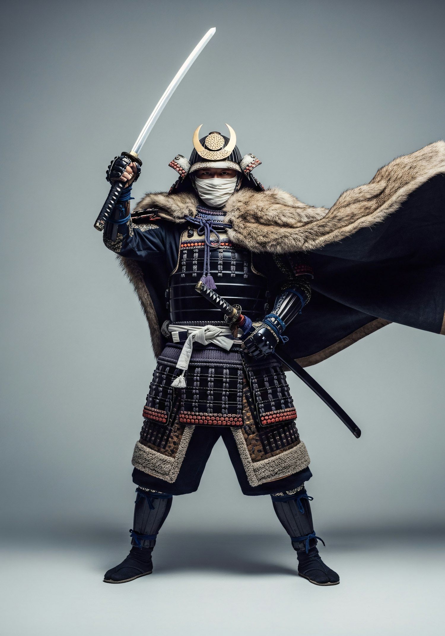 A samurai in traditional armor with a raised katana, wearing a fur-lined cape and a crescent-adorned helmet, against a neutral background.