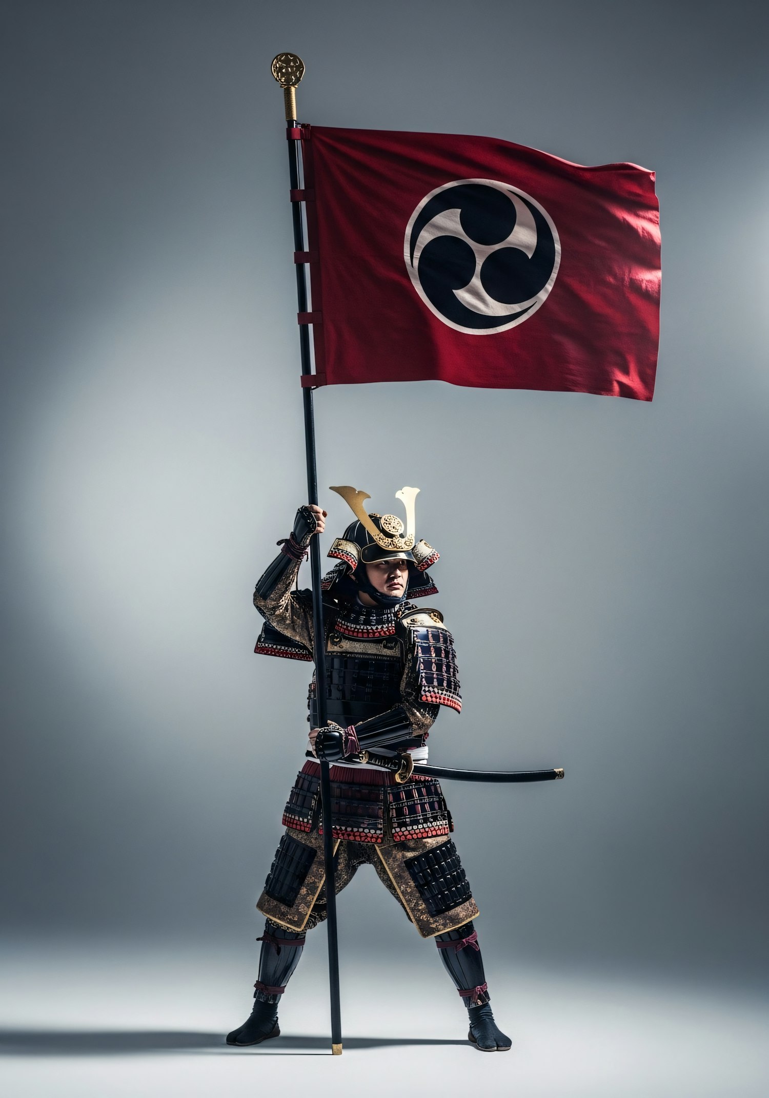 A samurai in traditional armor holds a red flag with a circular emblem, standing against a neutral background.
