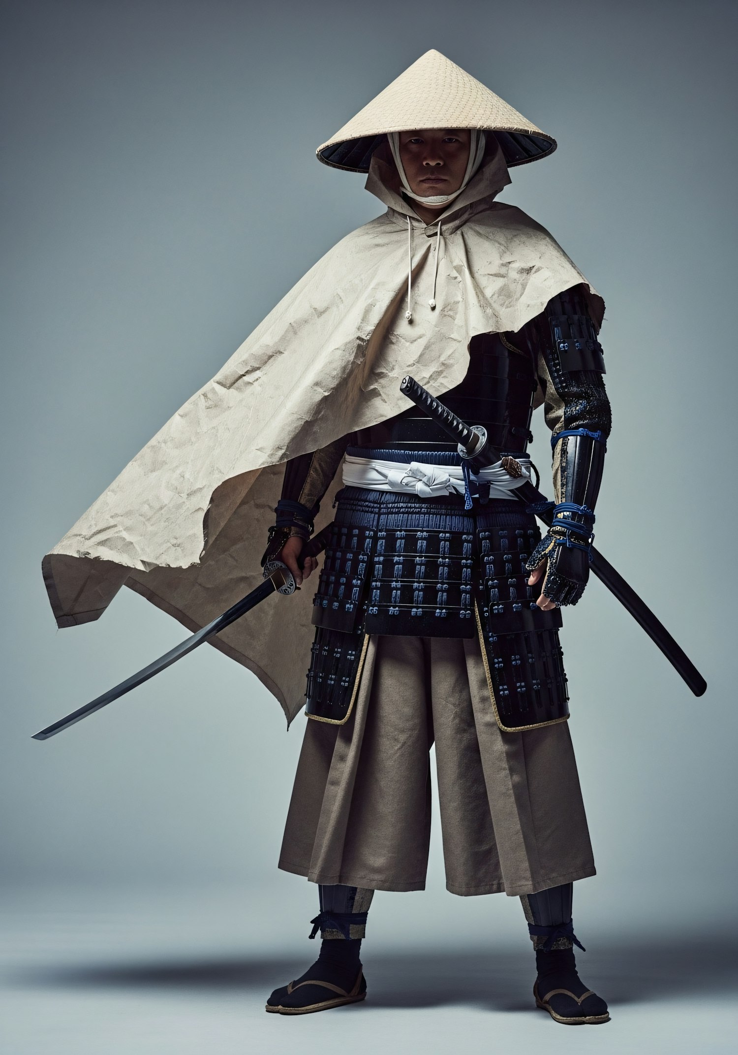 A person in traditional samurai armor with a katana, wearing a conical hat and beige cloak, standing against a neutral background.