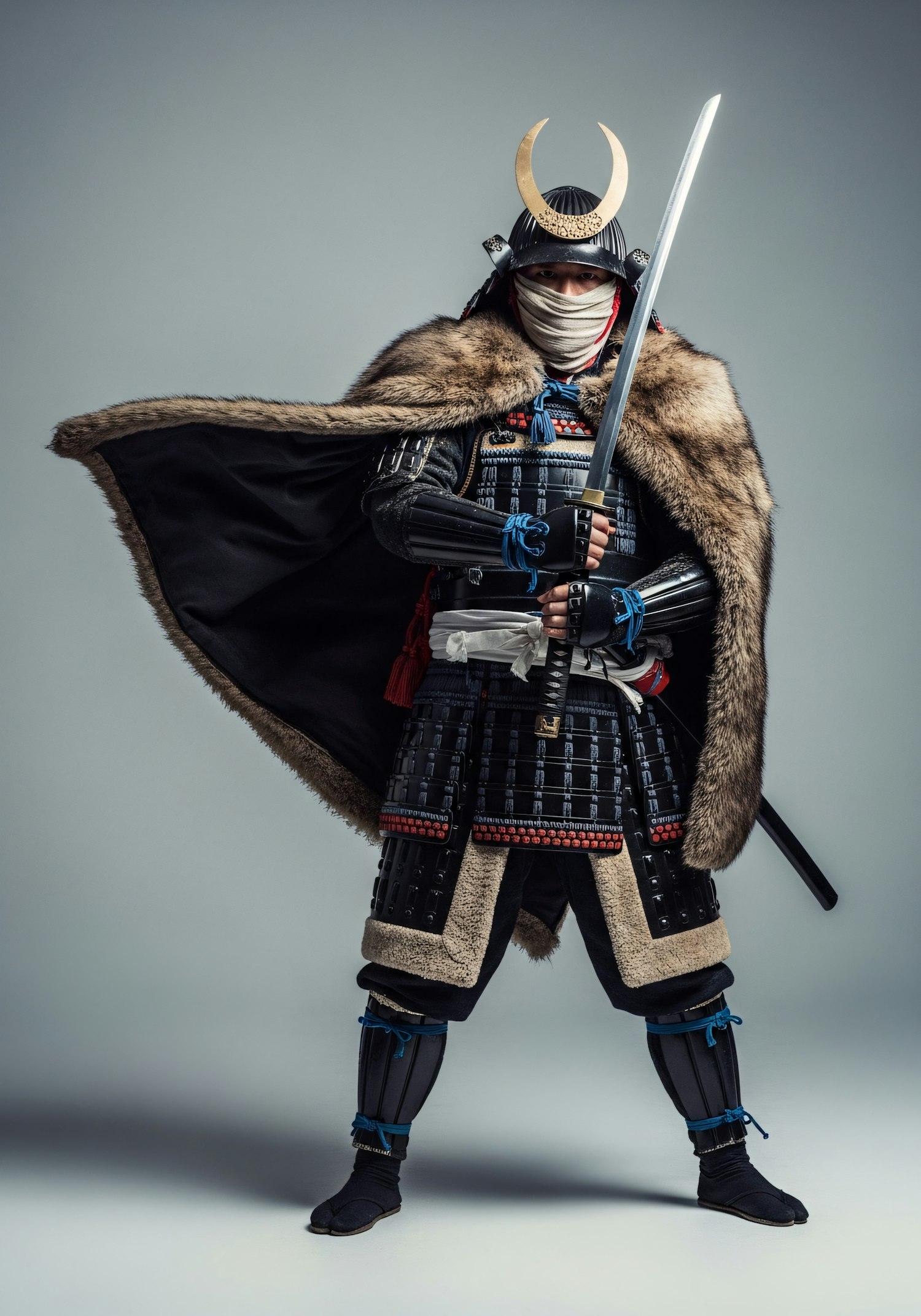 A samurai in traditional armor with a fur cape and crescent moon helmet, holding a katana, set against a neutral background.