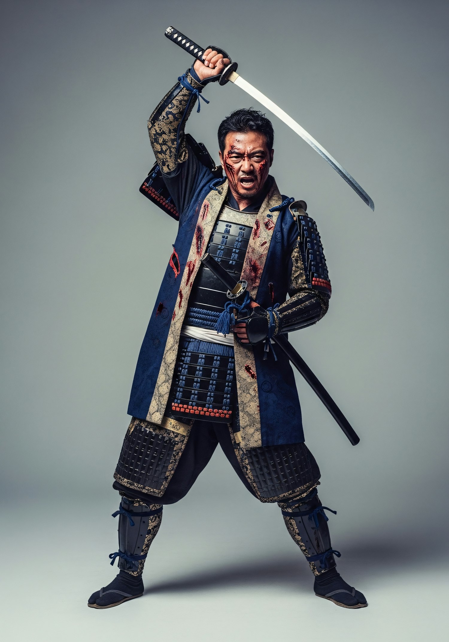 A samurai in detailed armor poses with a raised katana, showcasing intense expression and intricate traditional attire.