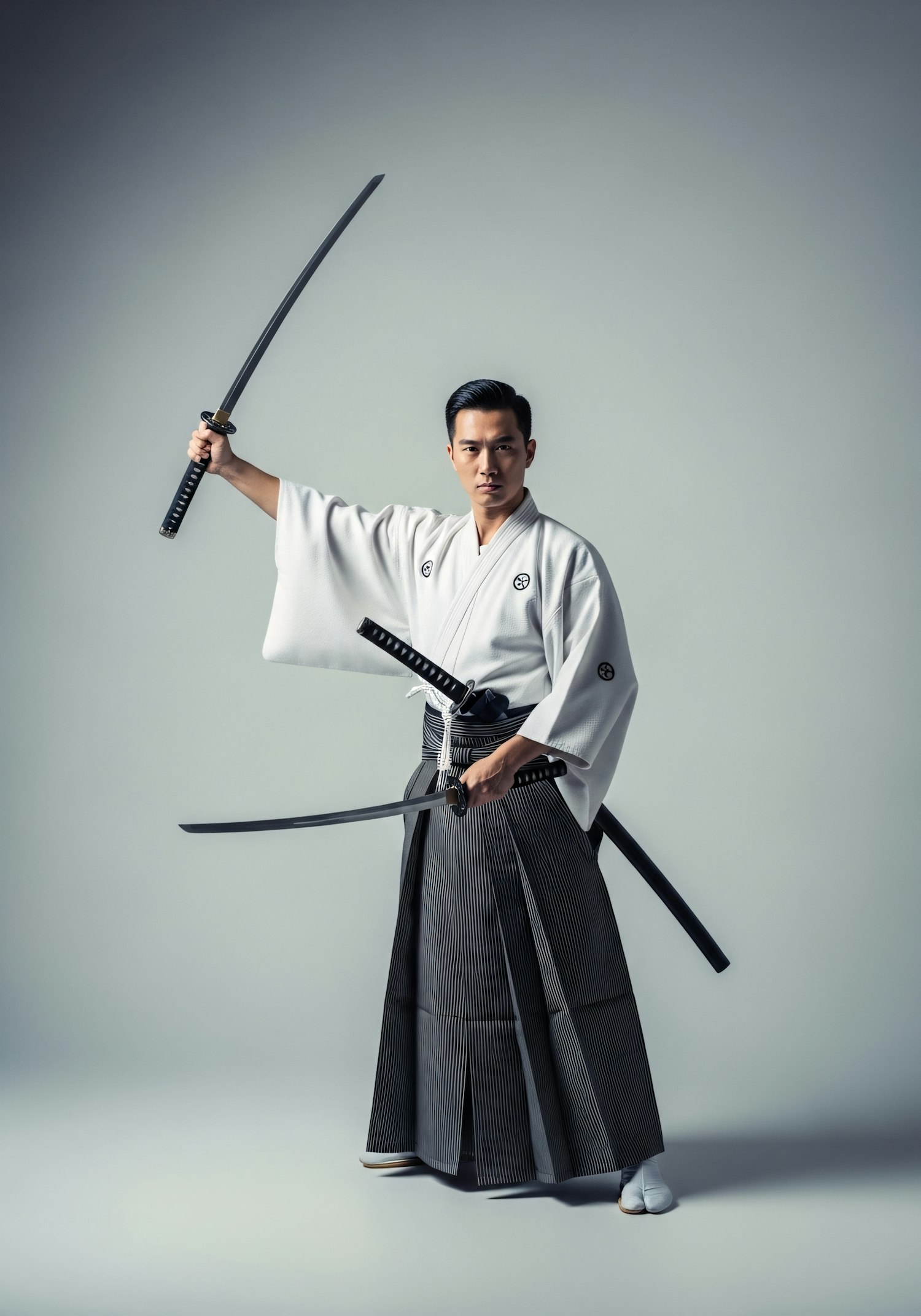 A man in traditional samurai attire holds two katana swords, showcasing a poised and disciplined stance against a neutral background.