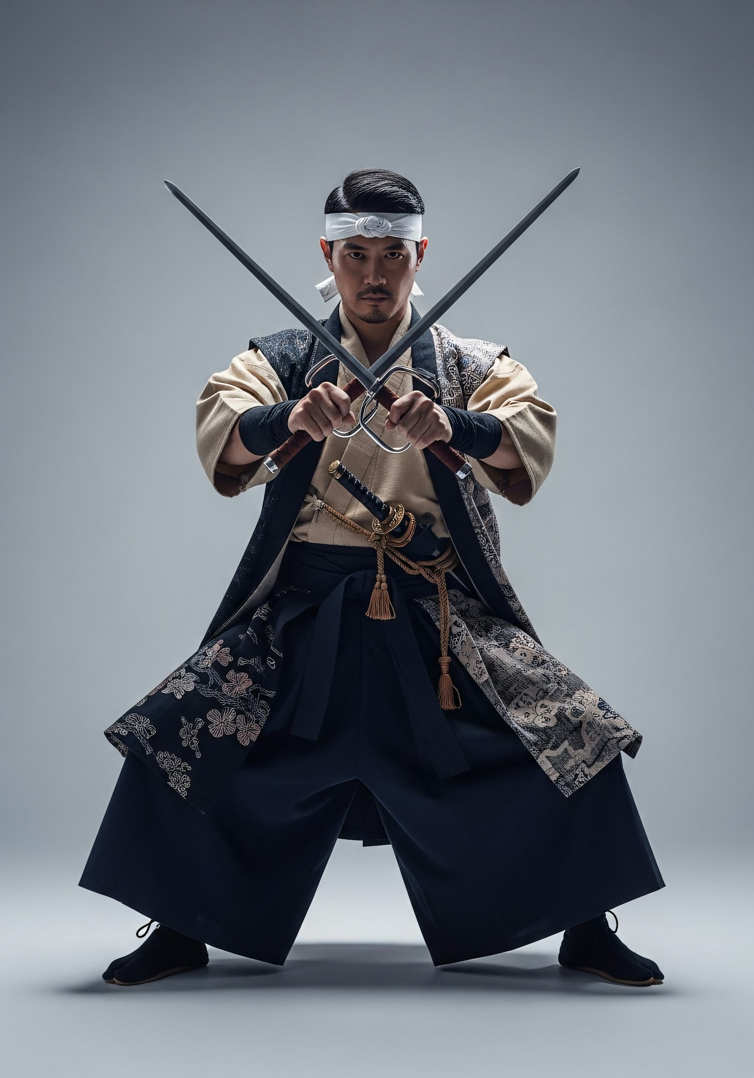 A samurai in traditional attire holds crossed swords, showcasing intricate patterns and a poised stance against a neutral background.
