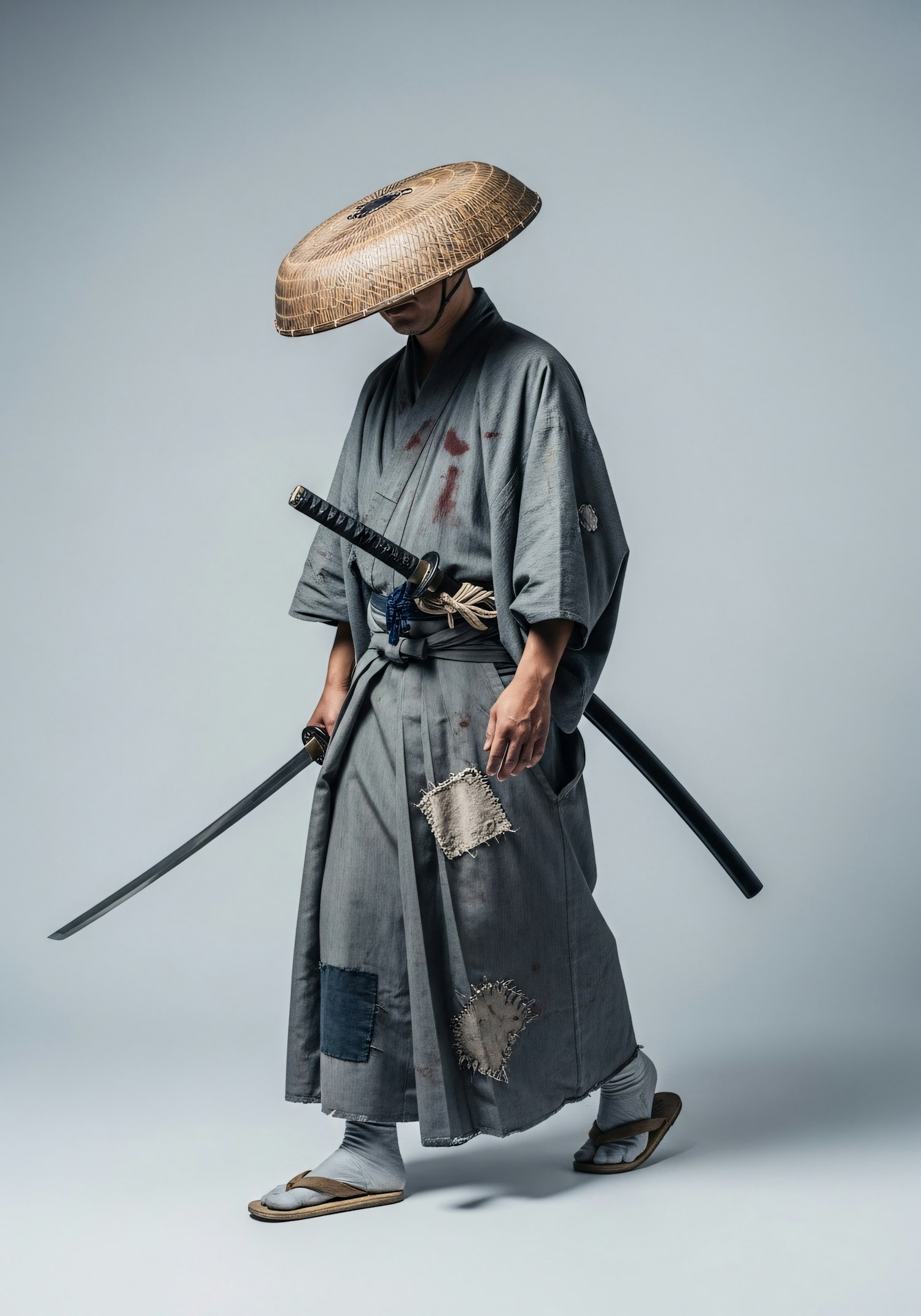 A samurai in a patched kimono and straw hat holds a katana, evoking a historical and traditional Japanese aesthetic.