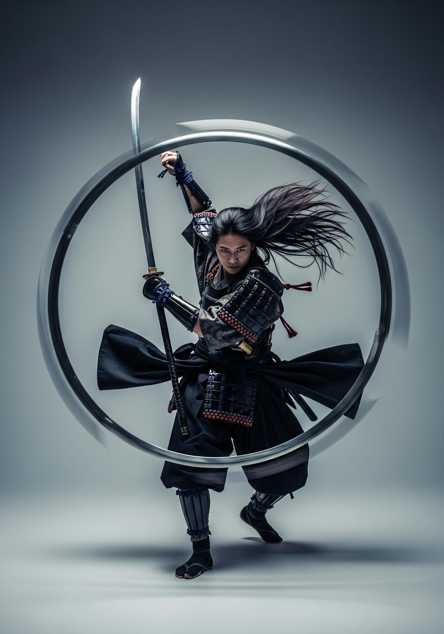 A samurai in traditional armor, mid-action with a katana, surrounded by a dynamic motion blur, creating a striking and energetic scene.
