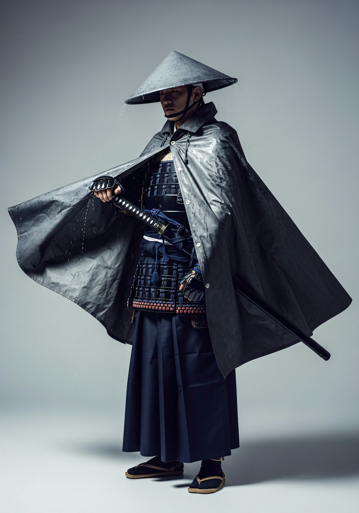 A person in traditional samurai armor with a katana, wearing a conical hat and cape, standing against a neutral background.