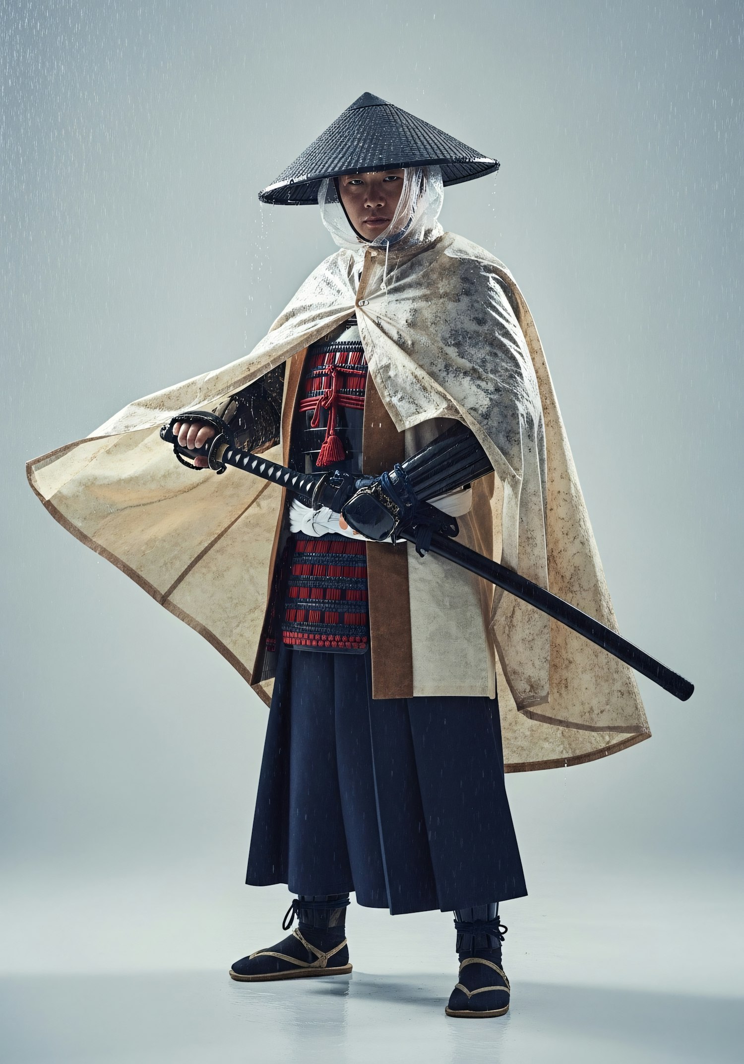 A samurai in traditional attire with a katana, standing in a dramatic rain setting, showcasing historical Japanese culture.