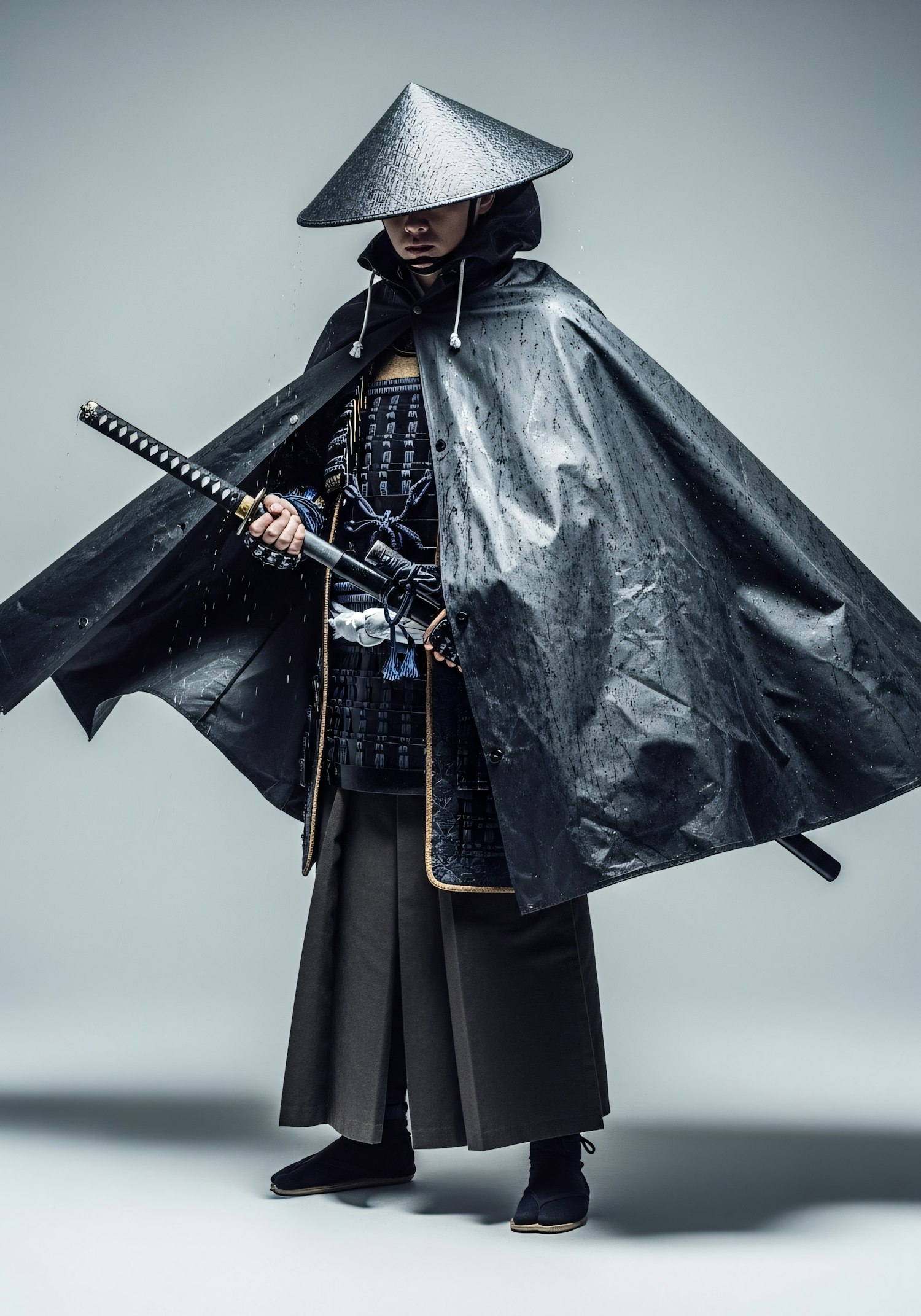 A person in traditional samurai attire with a katana and a conical hat, wearing a black cloak, standing against a neutral background.