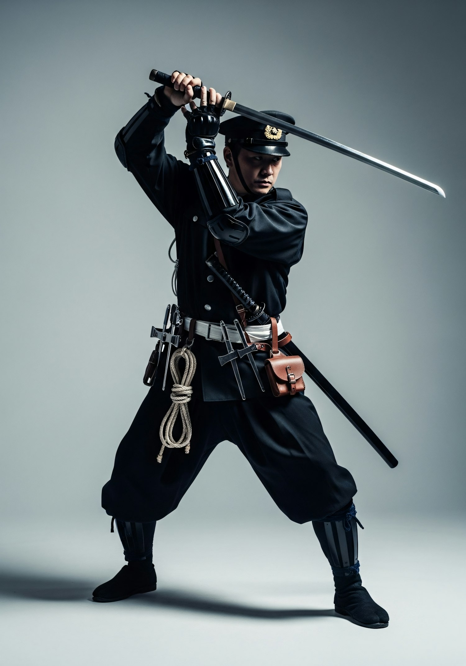 A person in traditional uniform holding a katana, showcasing a poised stance and detailed accessories against a neutral background.