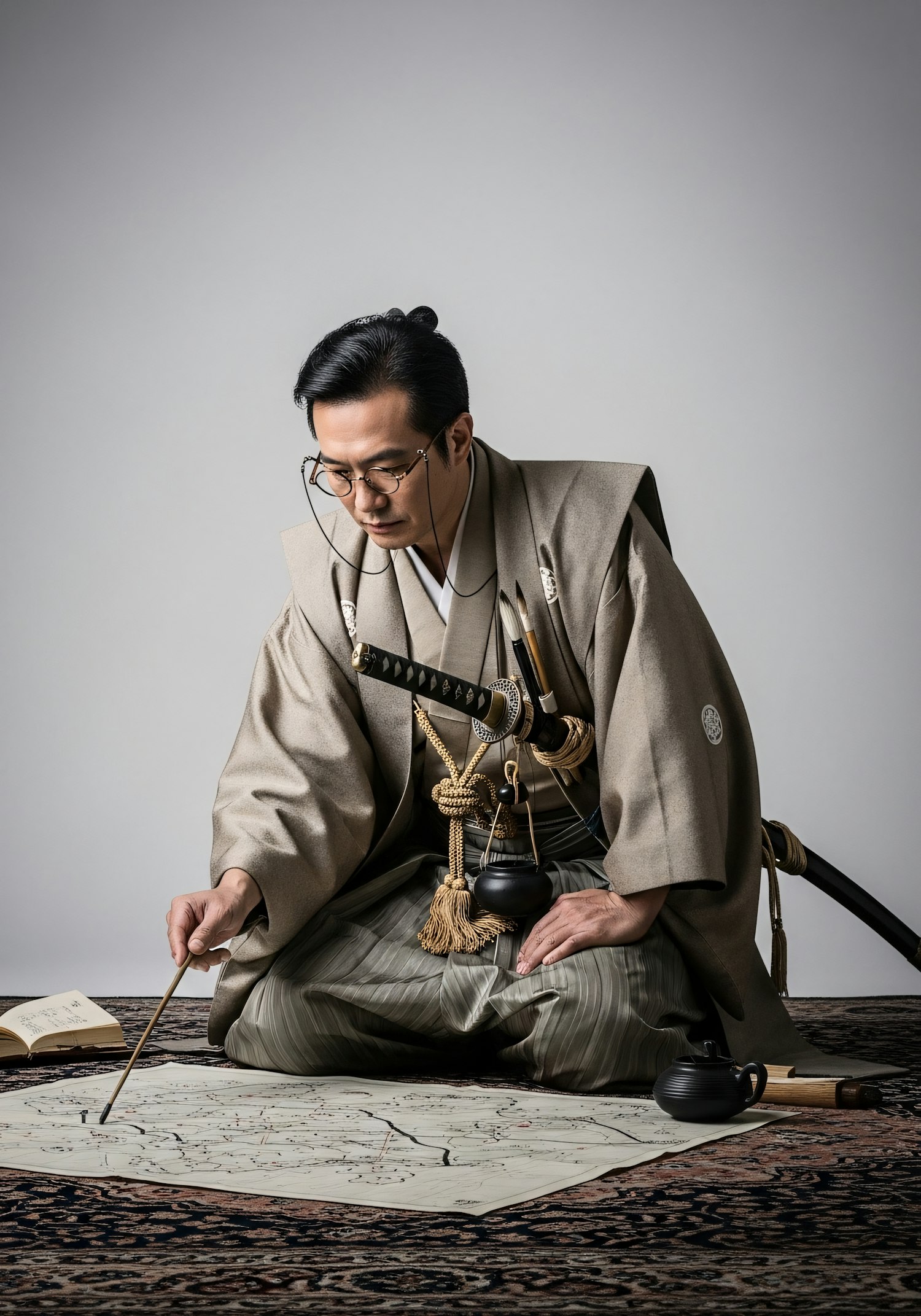 A man in traditional Japanese attire studies a map with a brush, showcasing cultural and historical elements in a minimalistic setting.