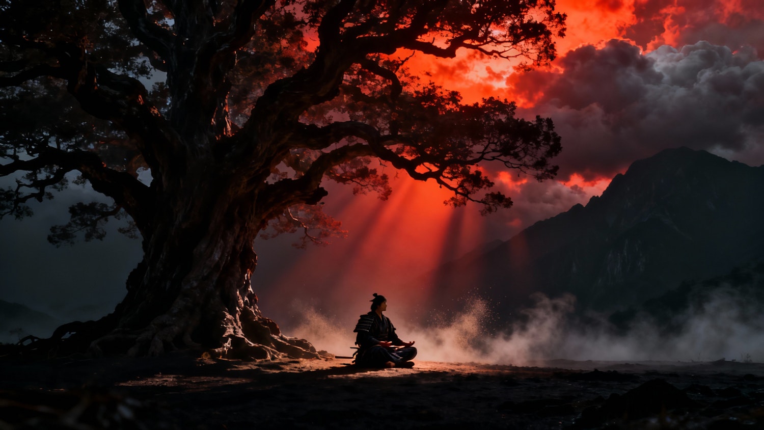 A samurai meditates under a tree with a dramatic red sky and misty mountains in the background, creating a serene yet powerful scene.