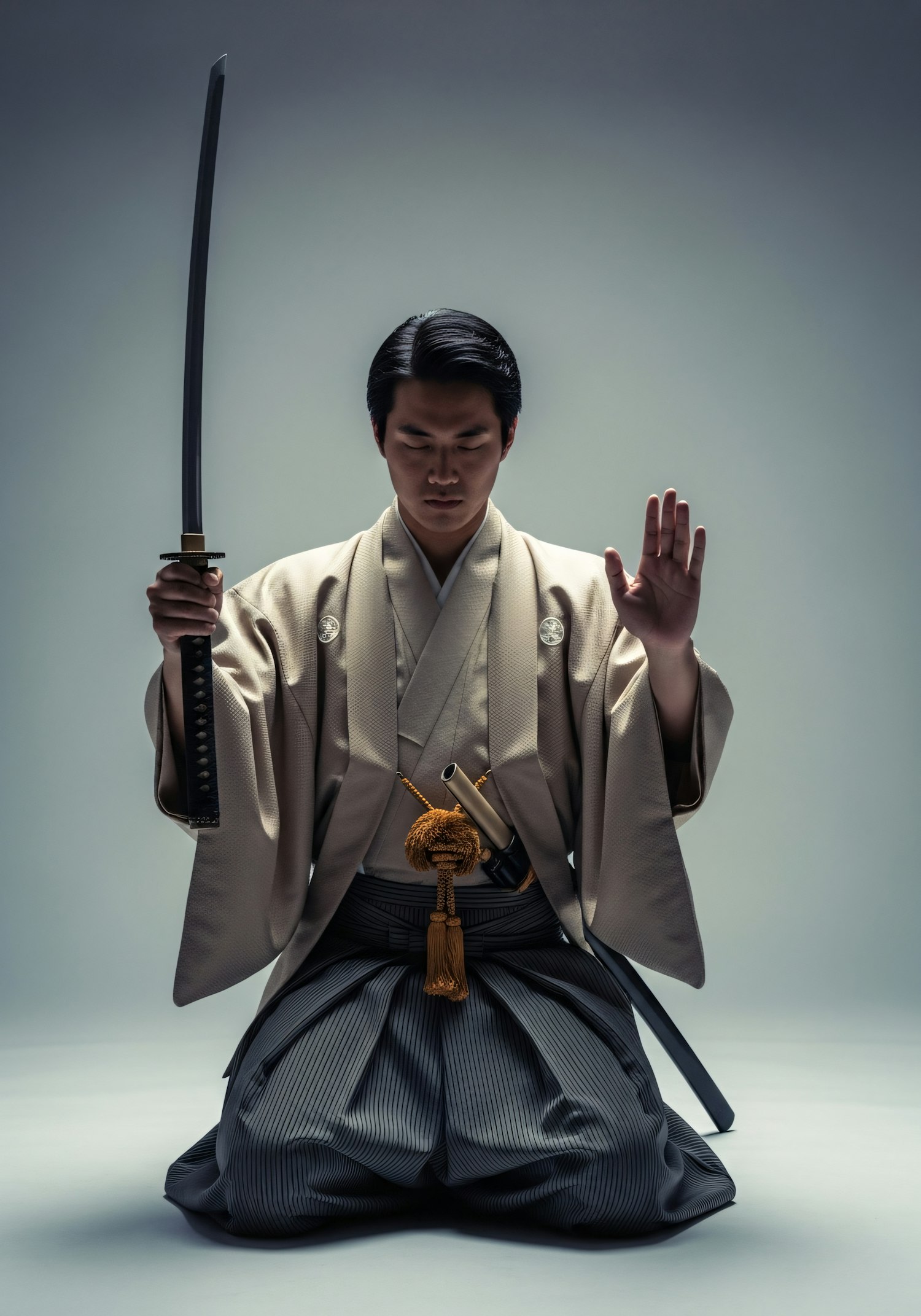 A person in traditional Japanese attire kneels, holding a katana, with a calm and focused expression, set against a neutral background.