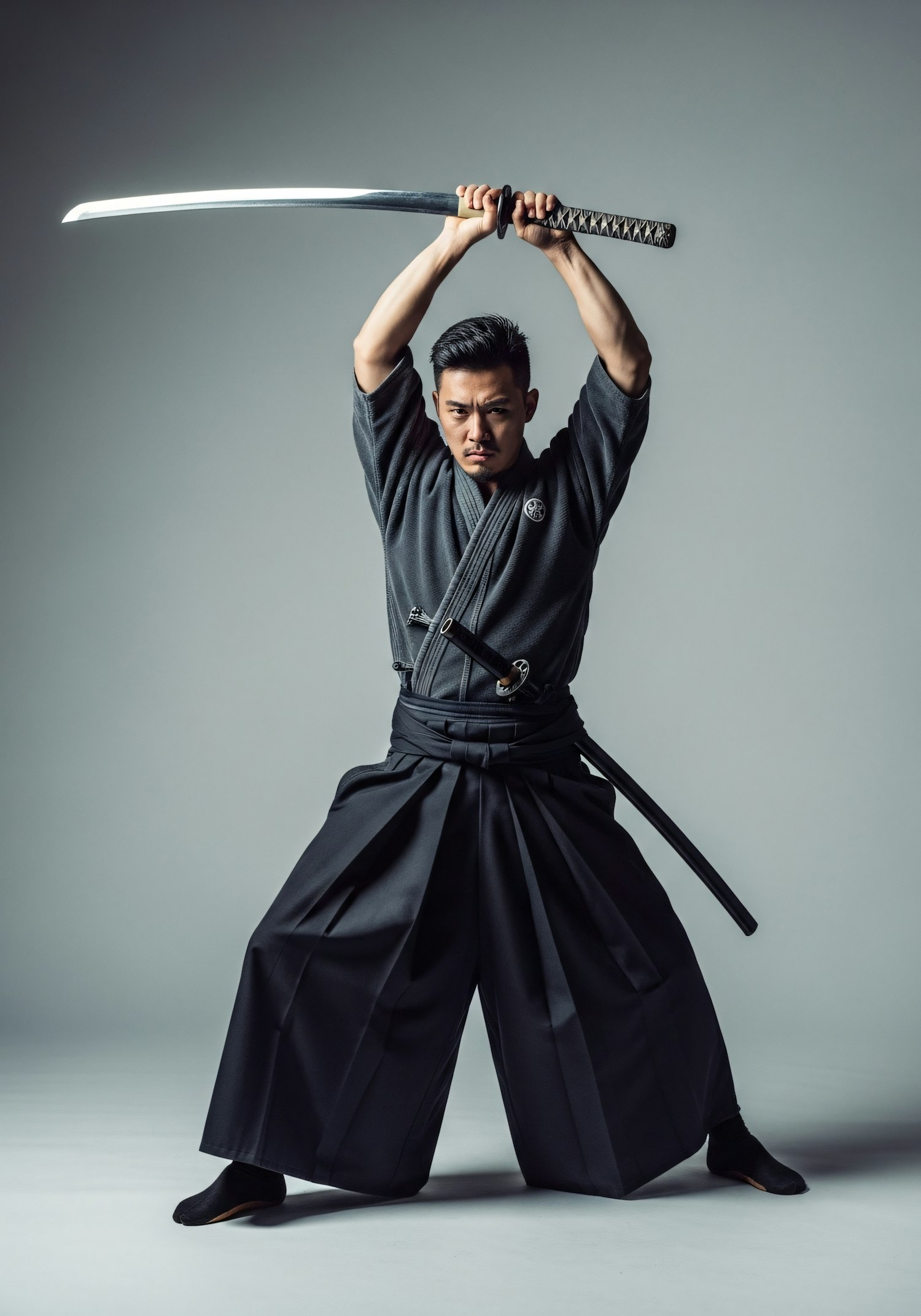 A martial artist in traditional attire holds a katana in a poised stance, showcasing focus and precision against a neutral background.