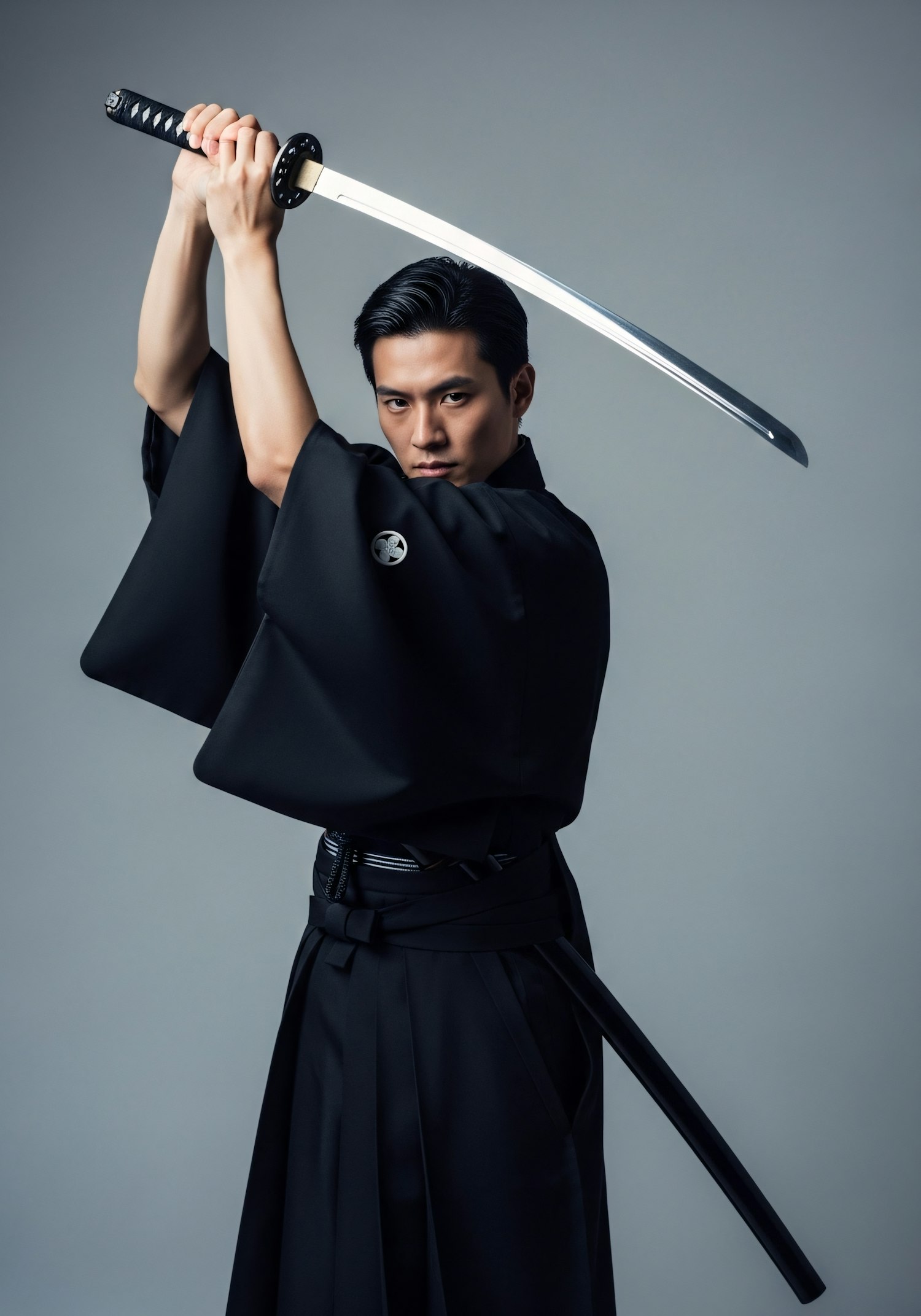 A person in traditional Japanese attire holds a katana in a poised stance, showcasing elegance and focus against a neutral background.