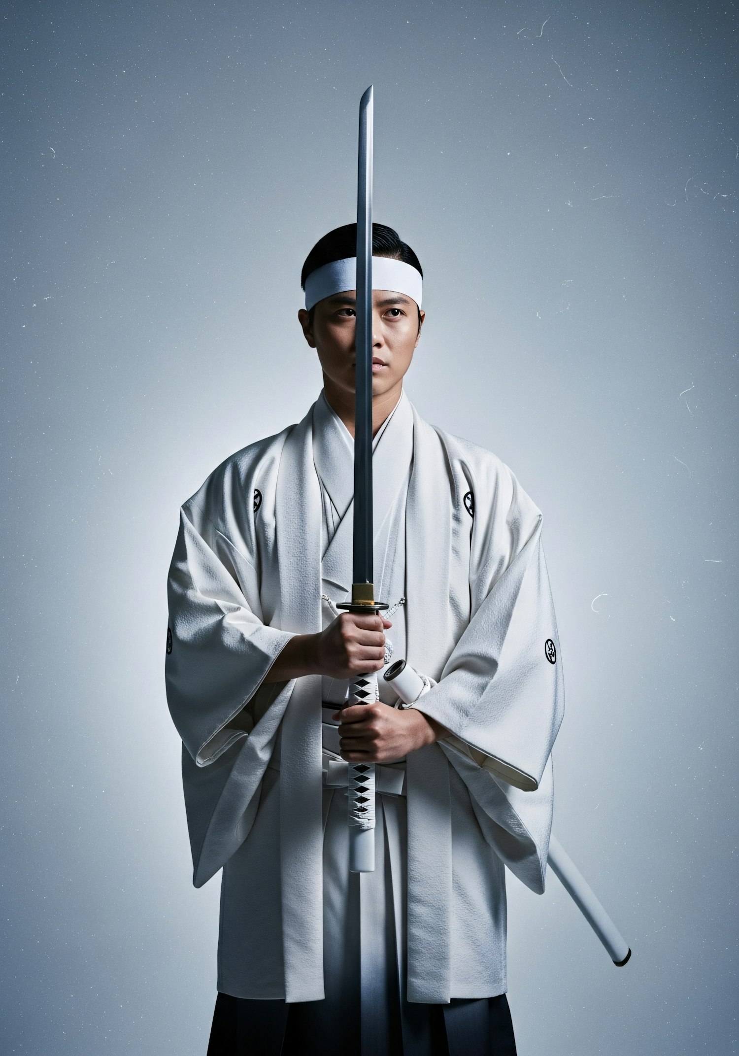 A person in traditional Japanese attire holding a katana sword, showcasing cultural heritage and ceremonial elegance.