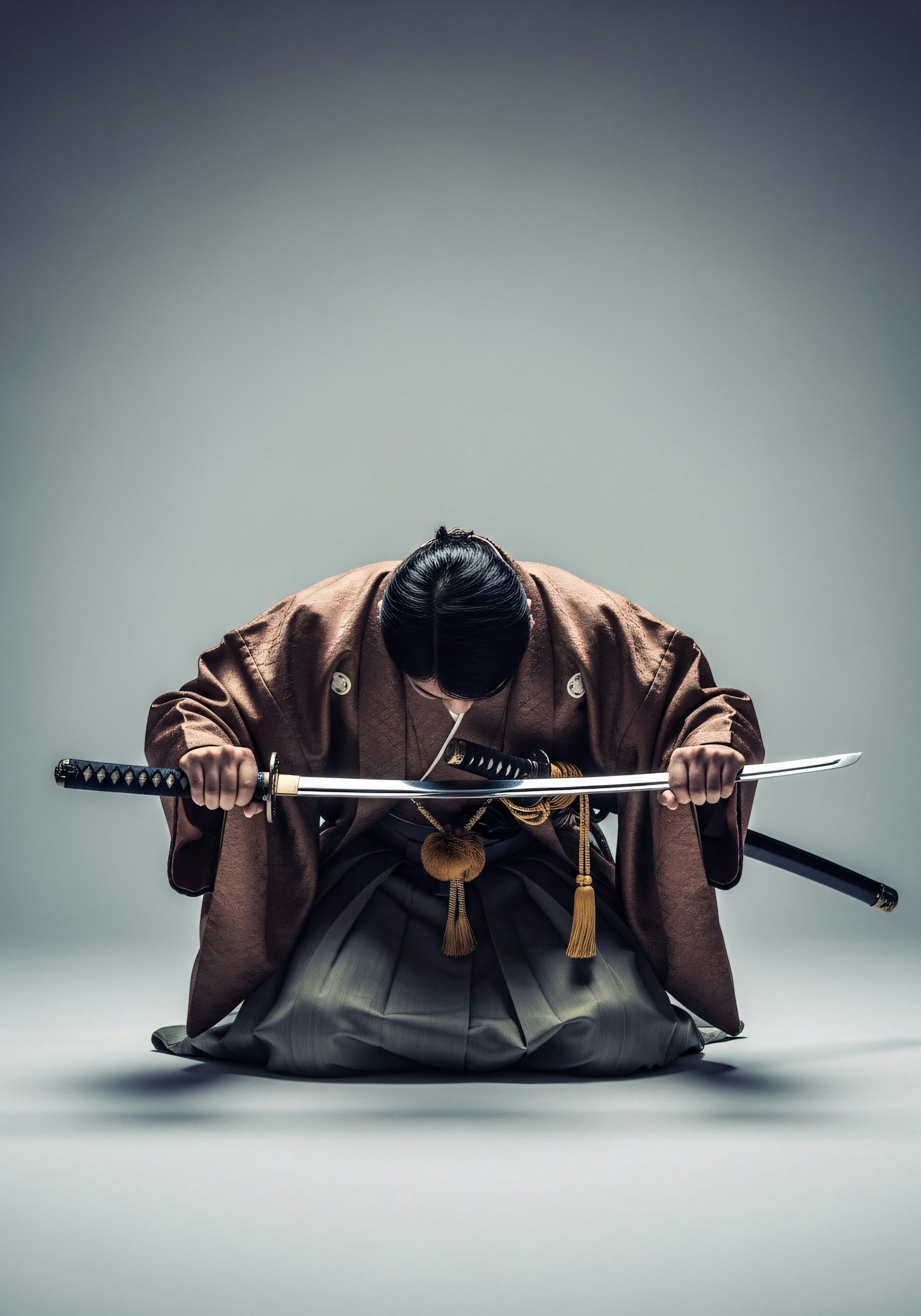 A person in traditional Japanese attire kneels solemnly, holding a katana sword, with a minimalistic background emphasizing the scene.