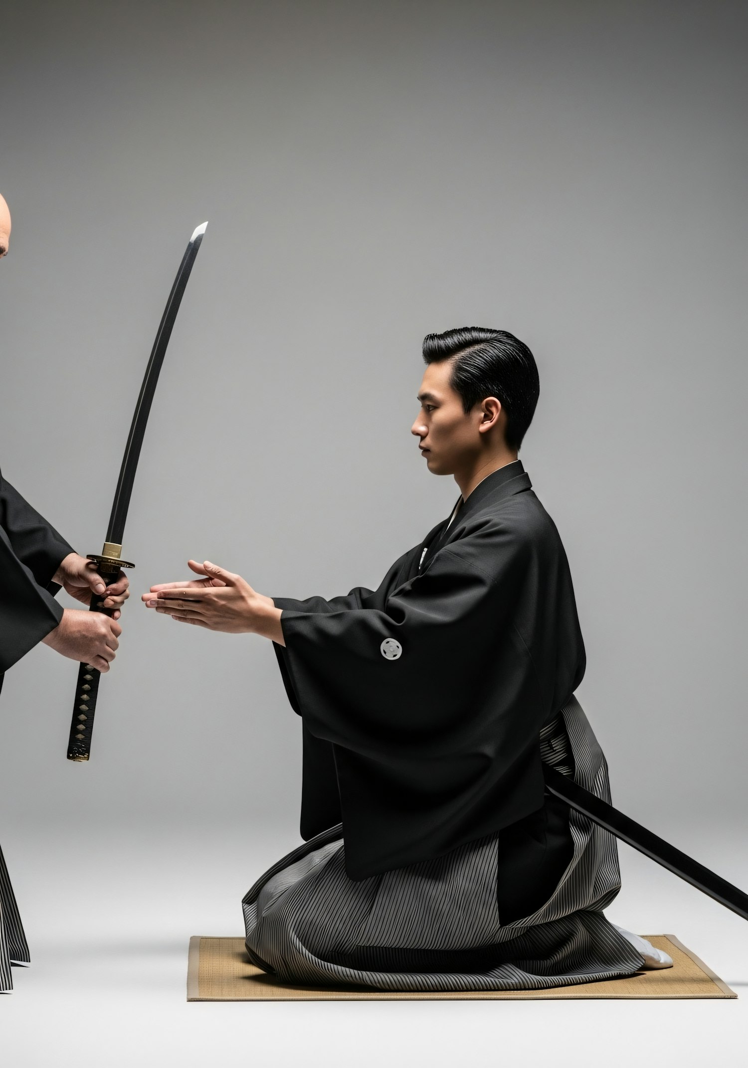 A man in traditional Japanese attire kneels, receiving a katana in a ceremonial setting, highlighting cultural heritage and tradition.
