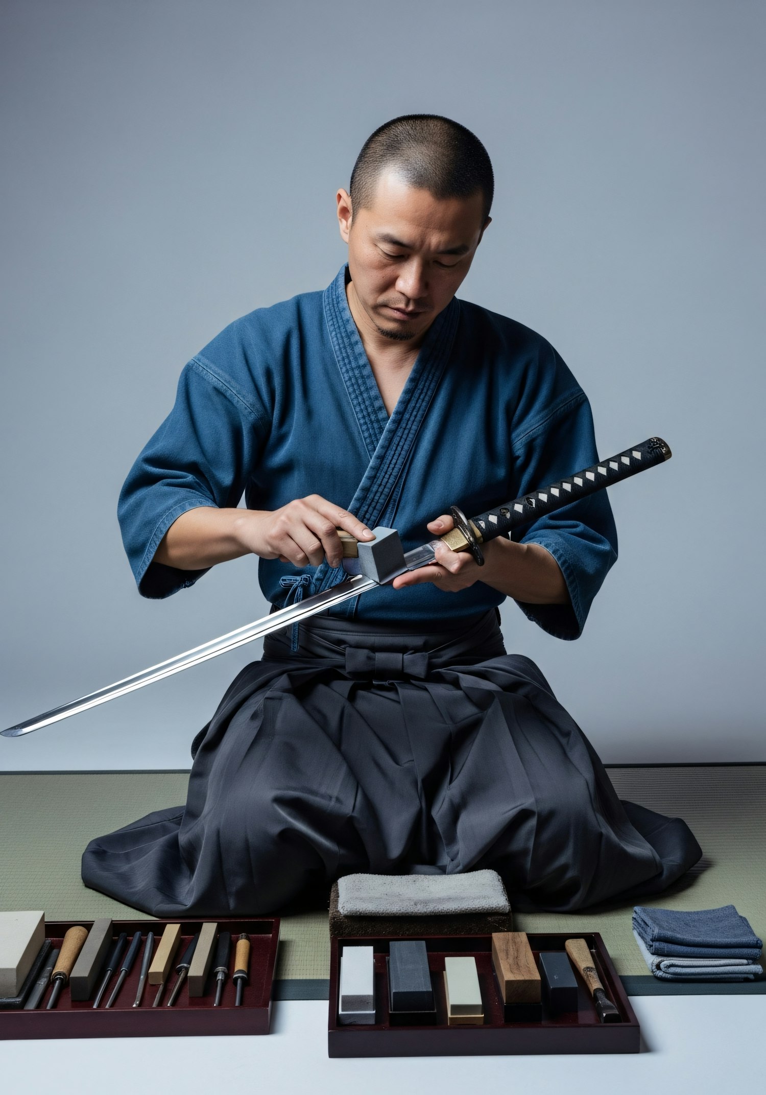 A man in traditional Japanese attire polishes a katana sword with precision, surrounded by tools for maintenance, on a tatami mat.