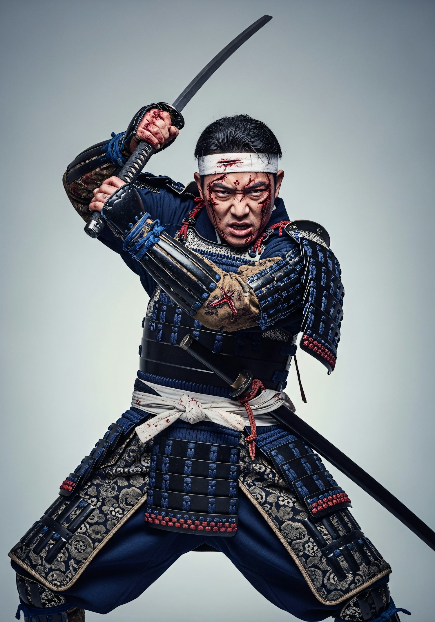 A samurai warrior in detailed armor, holding a katana in a dynamic pose, with a fierce expression and battle-worn appearance.