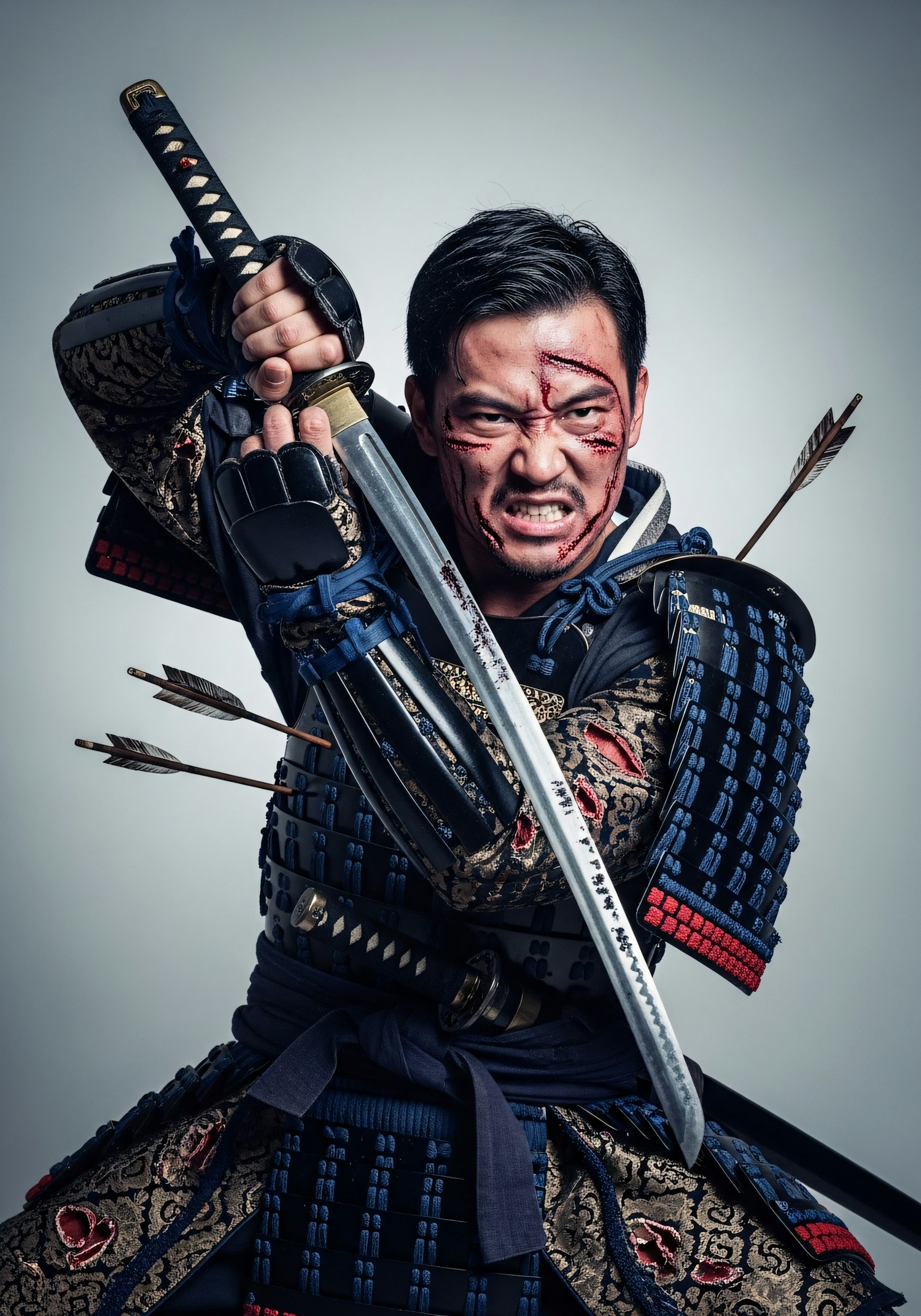 A fierce samurai in ornate armor wields a katana, showing battle scars and arrows lodged in his armor, embodying strength and resilience.
