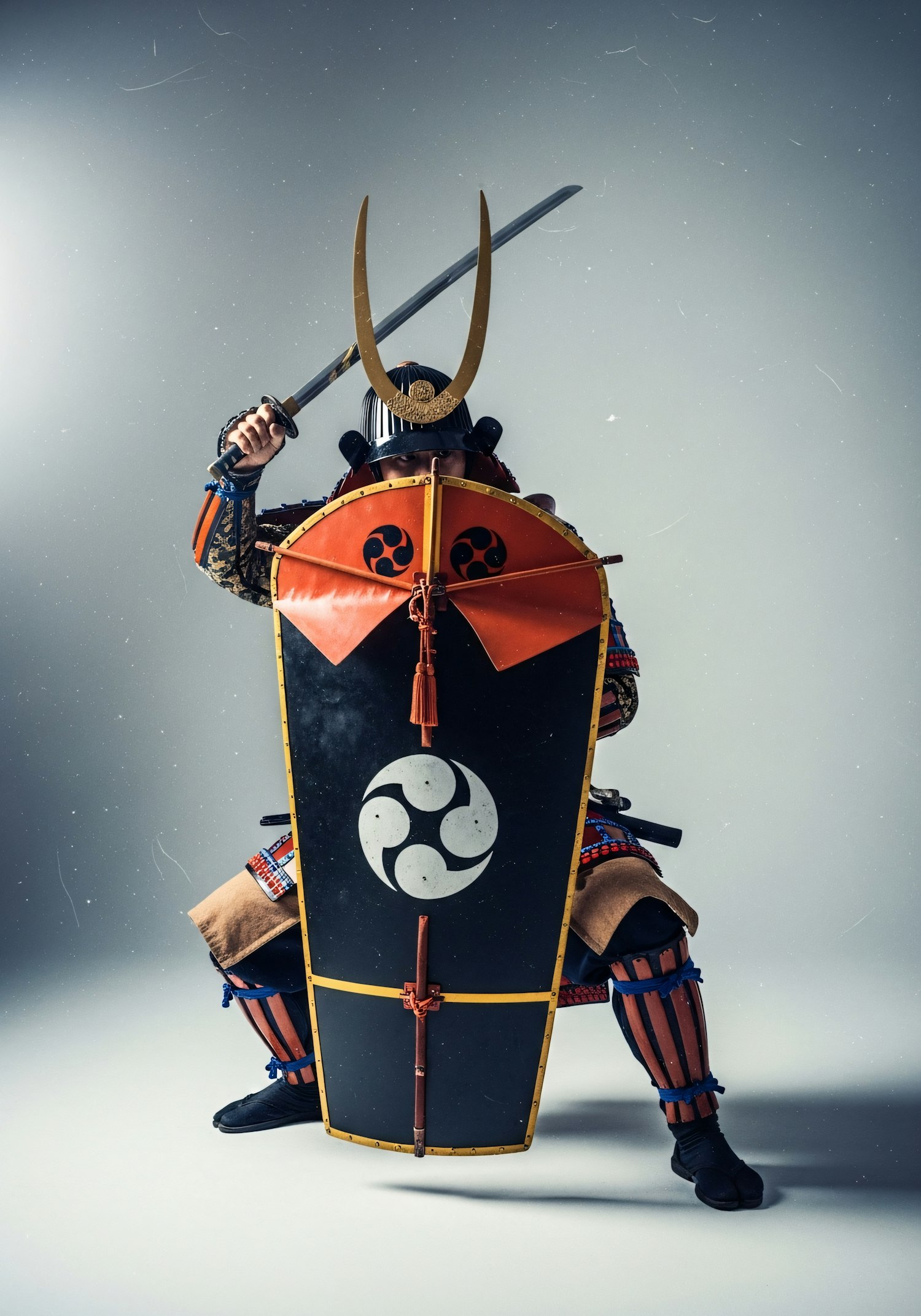 A samurai in traditional armor with a sword and shield, showcasing intricate details and vibrant colors against a neutral background.