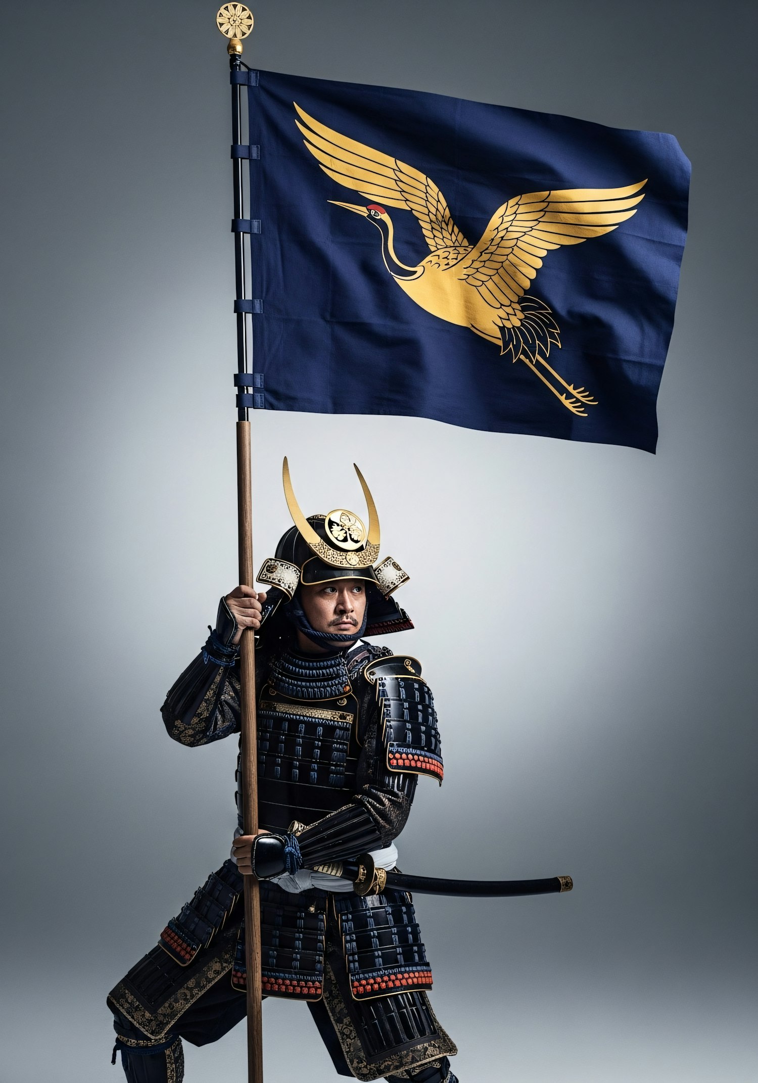 A samurai in traditional armor holds a flag with a golden crane emblem, showcasing historical Japanese culture and artistry.