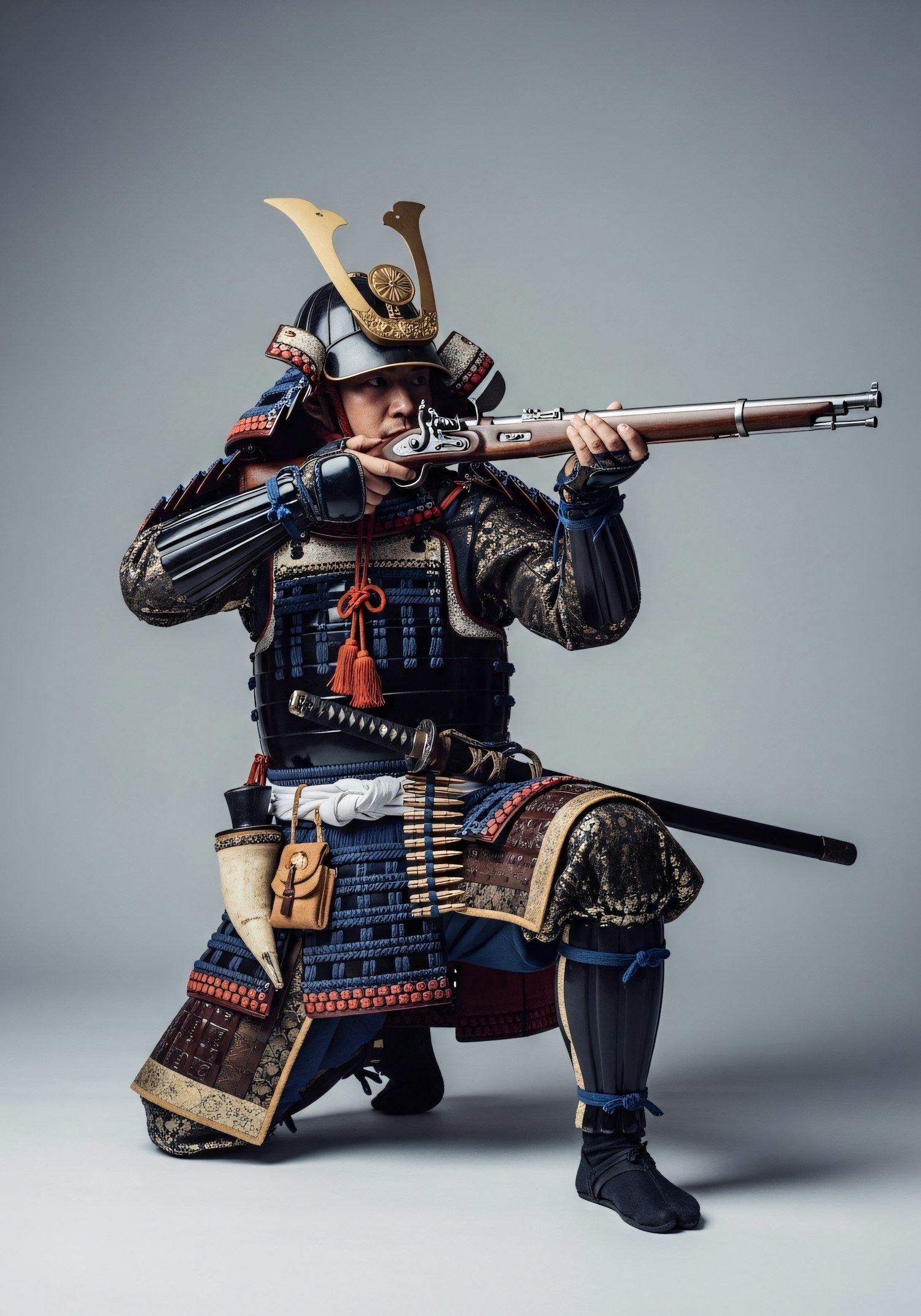 A samurai in traditional armor kneels while aiming a matchlock firearm, showcasing historical Japanese craftsmanship and weaponry.