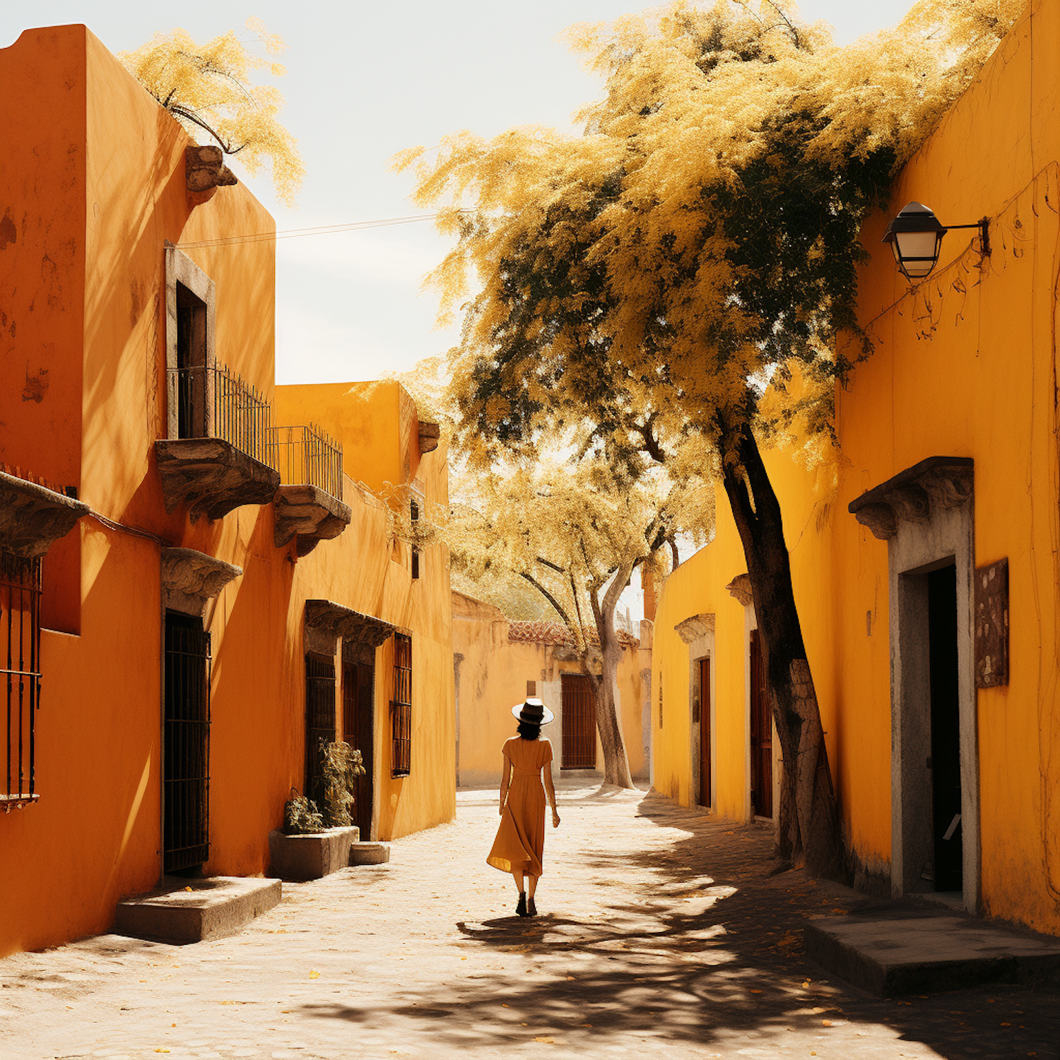 A woman in a yellow dress walks down a vibrant street with yellow buildings and trees, creating a warm, sunlit atmosphere.