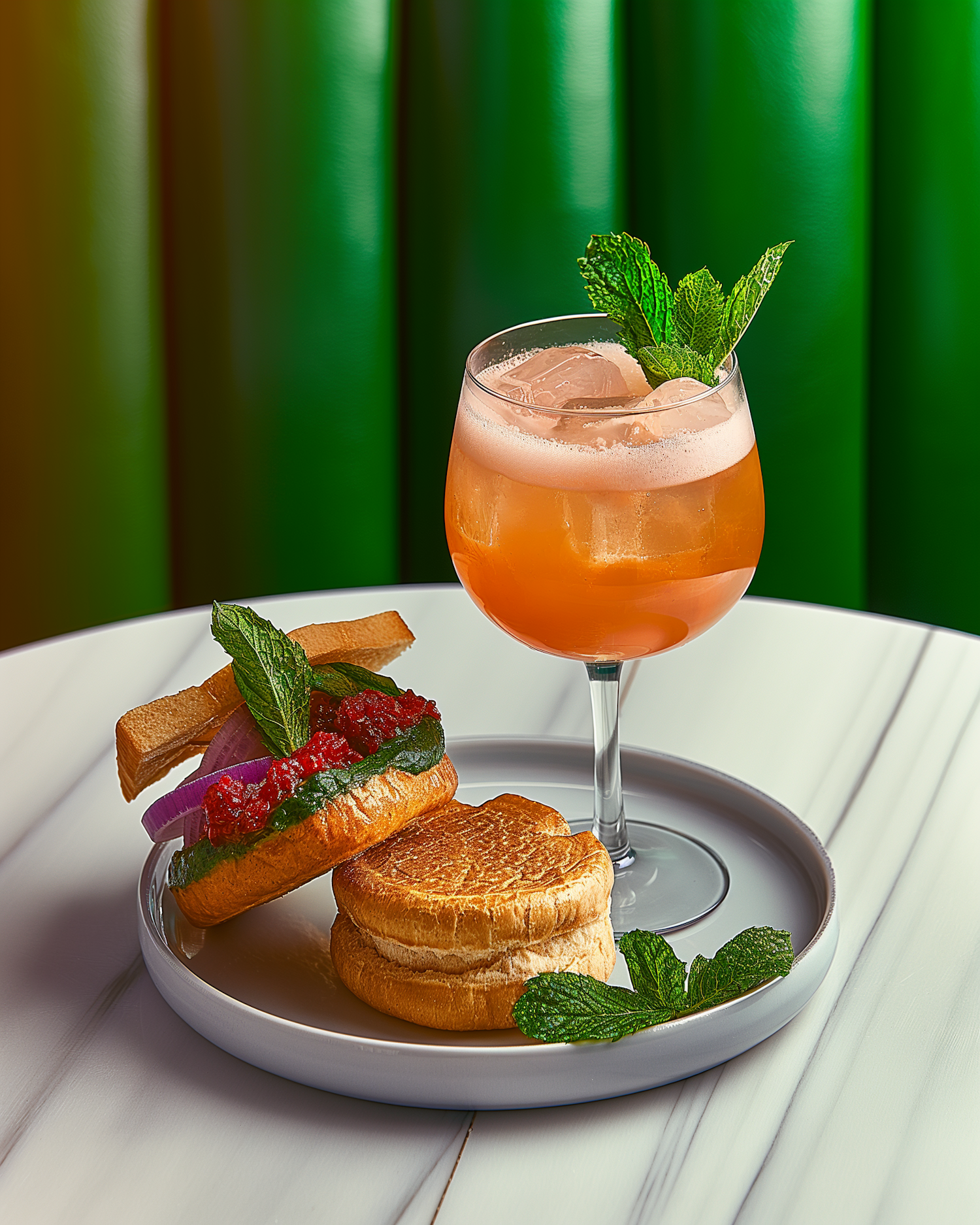 Refreshing cocktail with mint and gourmet sandwich on a white plate, set against a vibrant green background.
