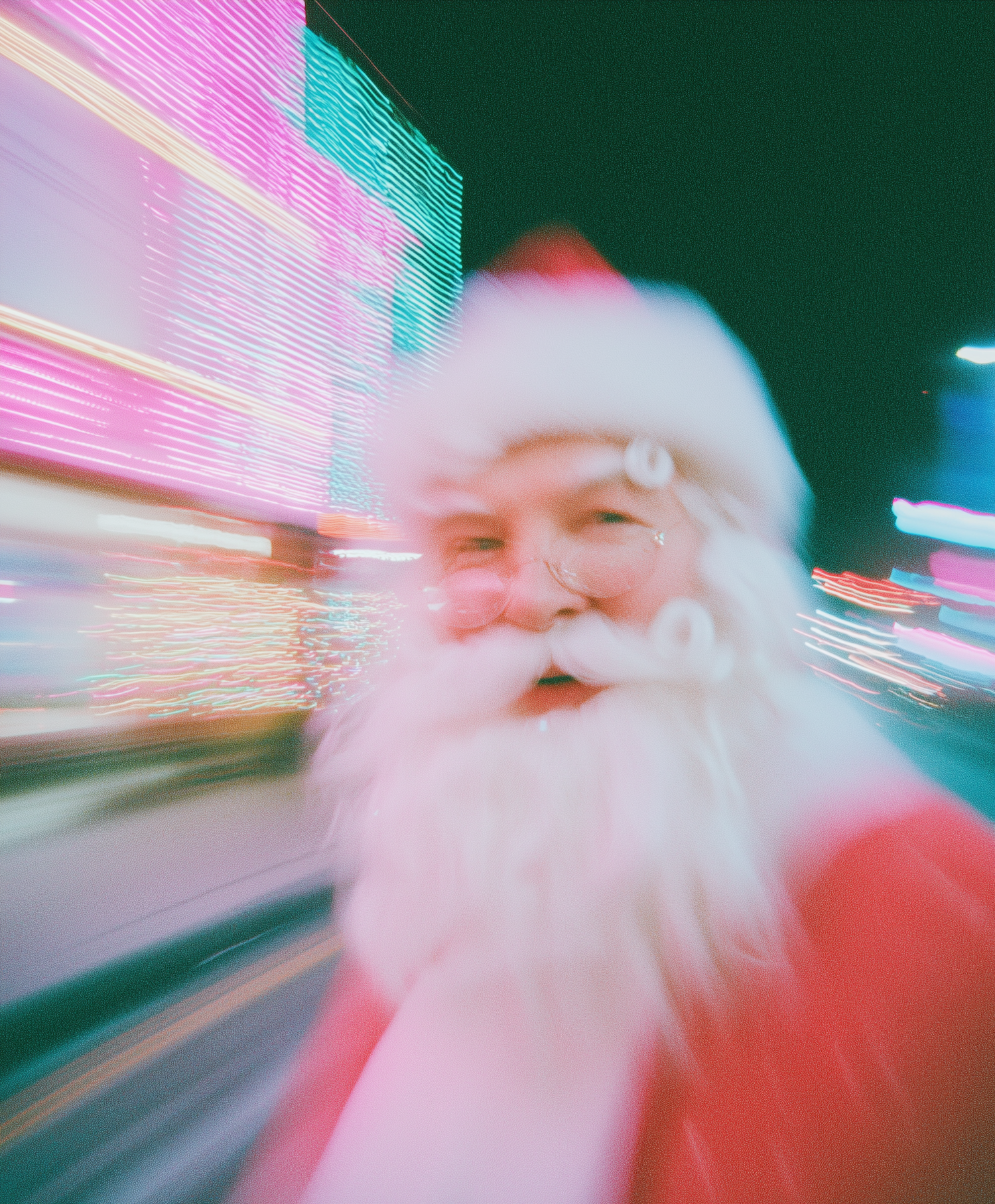 Santa Claus in a festive setting with colorful neon lights and a dynamic motion blur effect, capturing the holiday spirit.