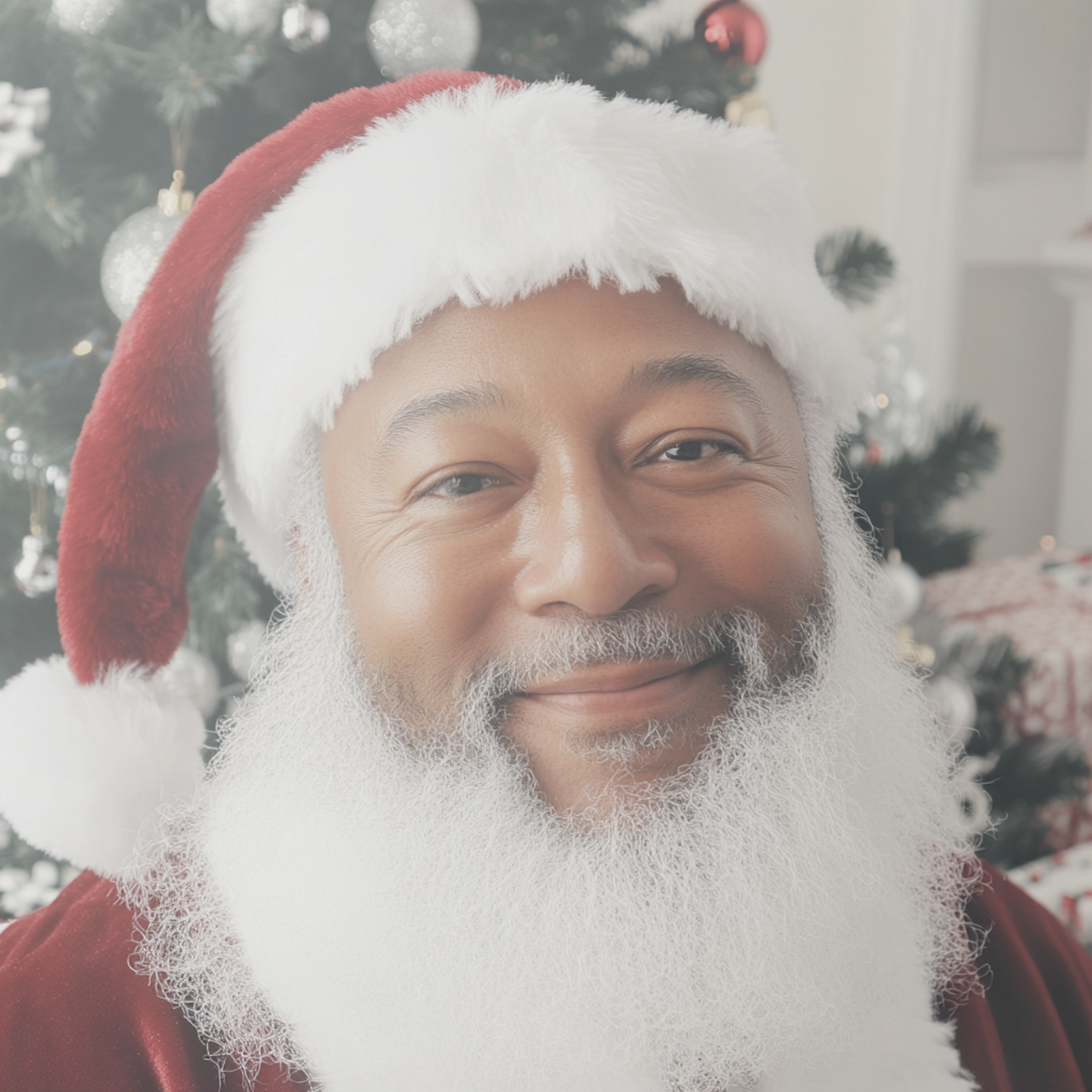 A joyful Santa Claus with a white beard and red hat smiles warmly in front of a decorated Christmas tree.