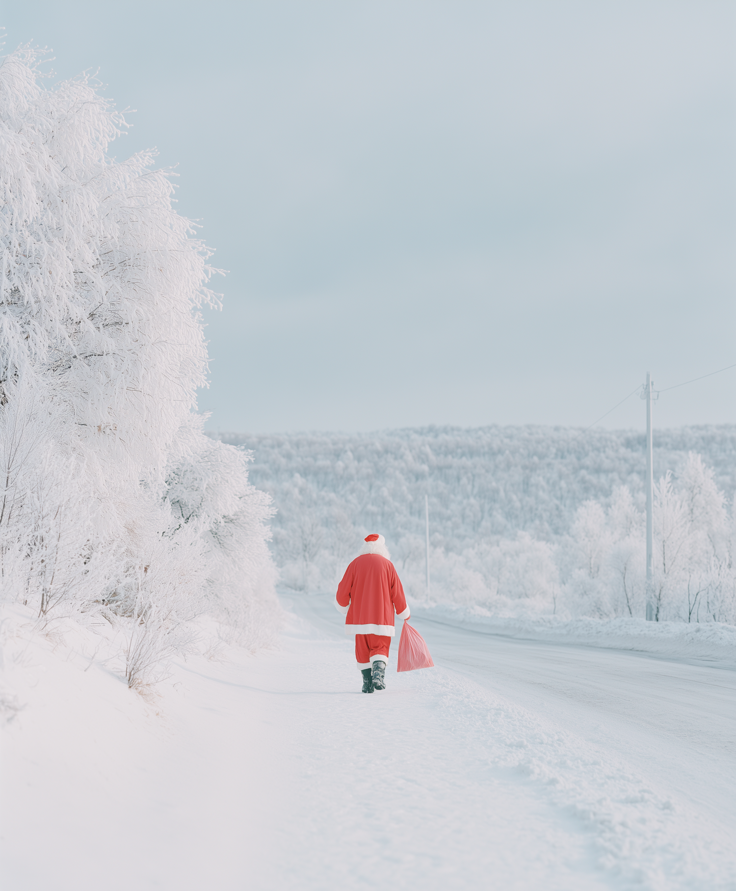 Santa Claus walking along a snowy path with a red sack, surrounded by frost-covered trees and a serene winter landscape.