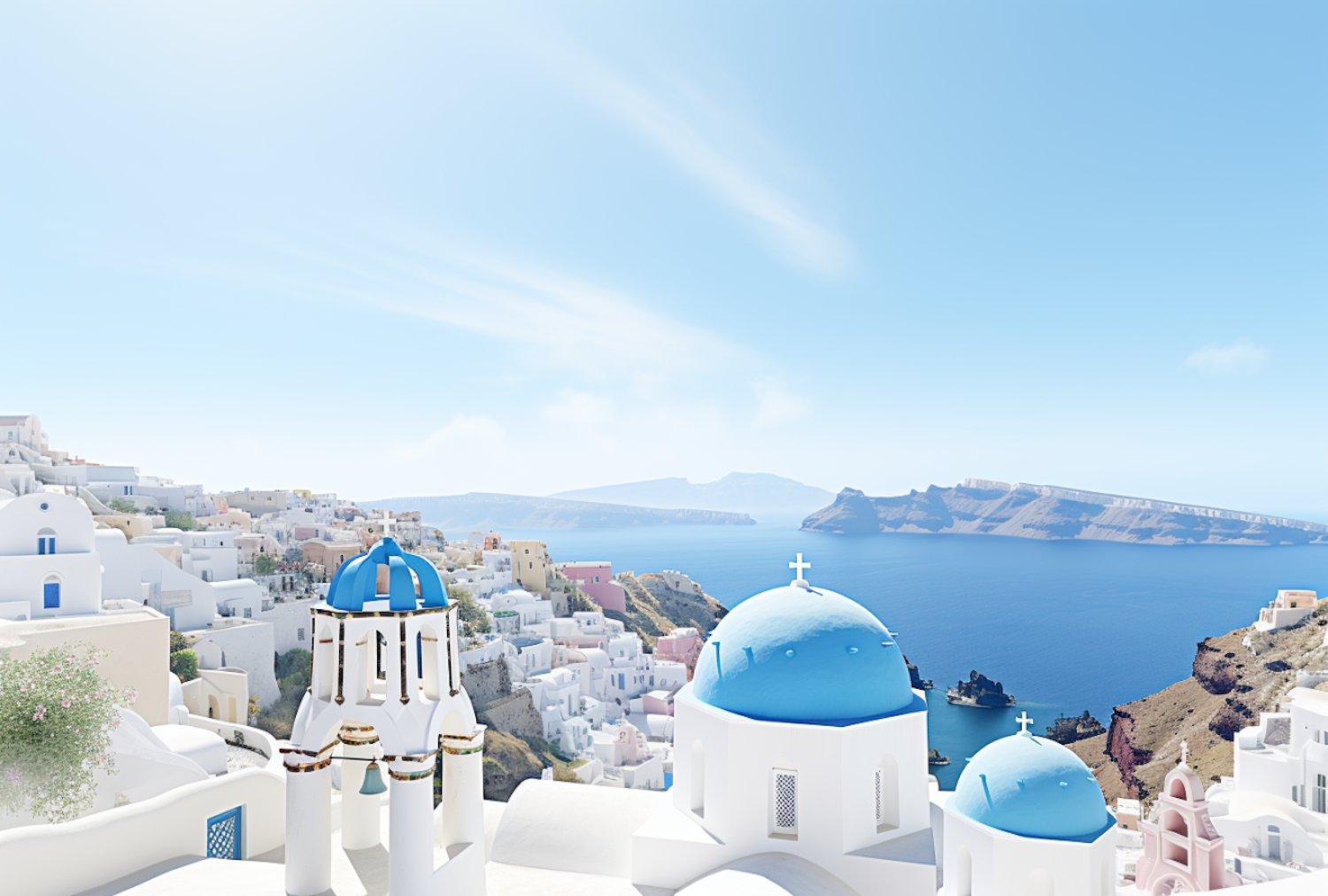 Stunning view of Santorini's white buildings and blue domes against the Aegean Sea, capturing Mediterranean charm and tranquility.