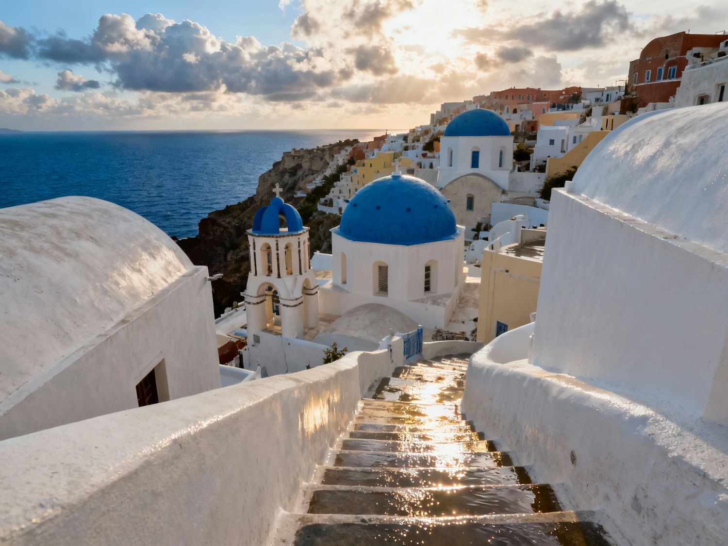 A stunning view of Santorini's whitewashed buildings and blue domes at sunset, with the Aegean Sea in the background.