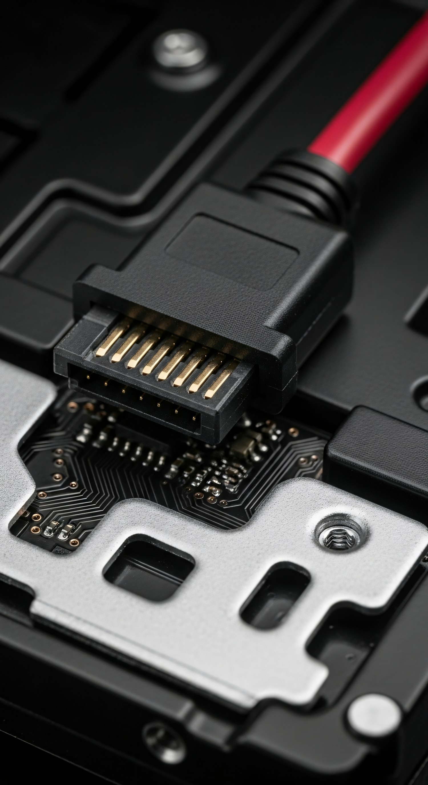 Close-up of a SATA cable connected to a hard drive, showcasing the gold-plated connectors and intricate circuit board details.