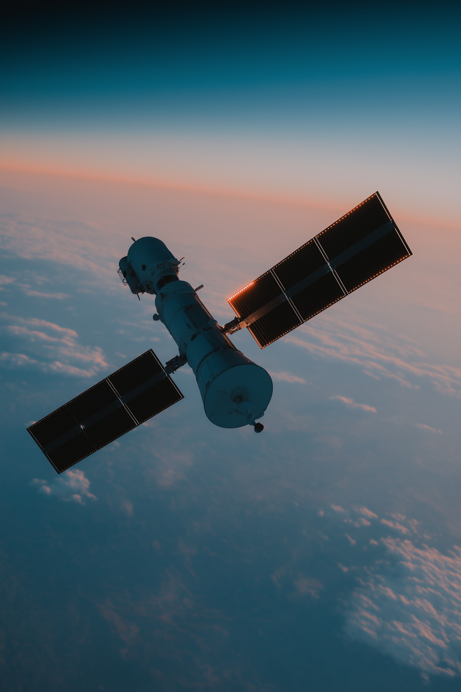 Satellite in orbit with solar panels against Earth's horizon at sunrise or sunset, showcasing space exploration.