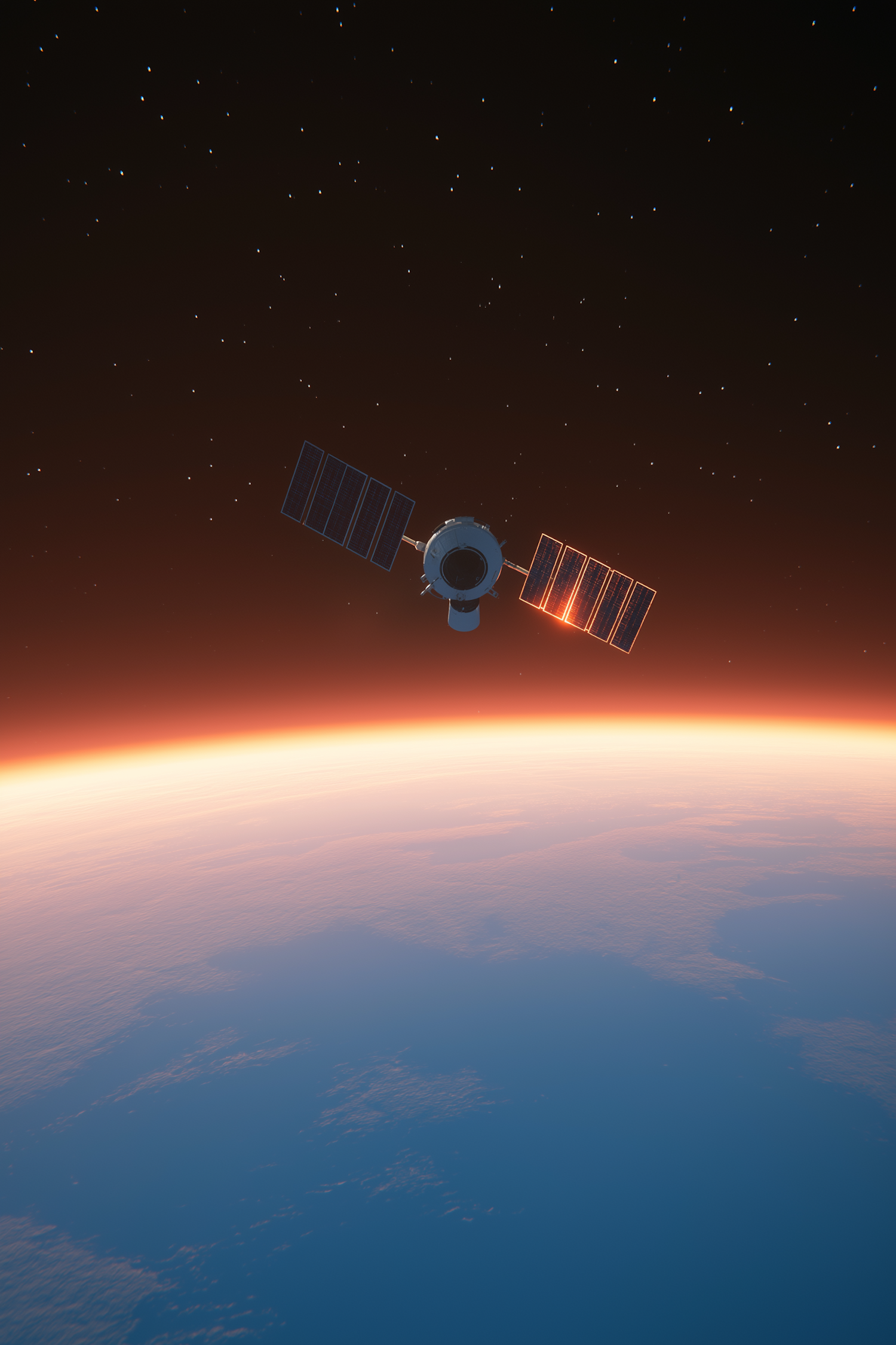 Satellite in space with solar panels, set against a starry sky and Earth's horizon glowing in orange, suggesting a sunrise or sunset.