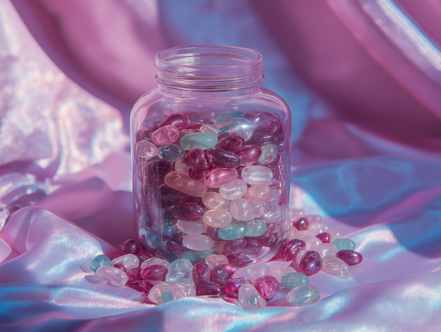 Vibrant, jelly beans in a jar on reflective pink satin, creating a bright, colorful, and visually striking composition.