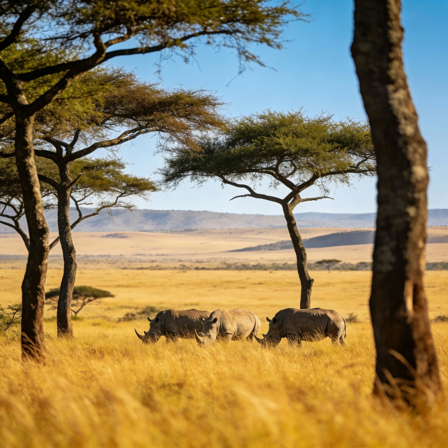 Three rhinoceroses graze in golden savanna grasslands, framed by acacia trees under a clear blue sky, showcasing African wildlife.