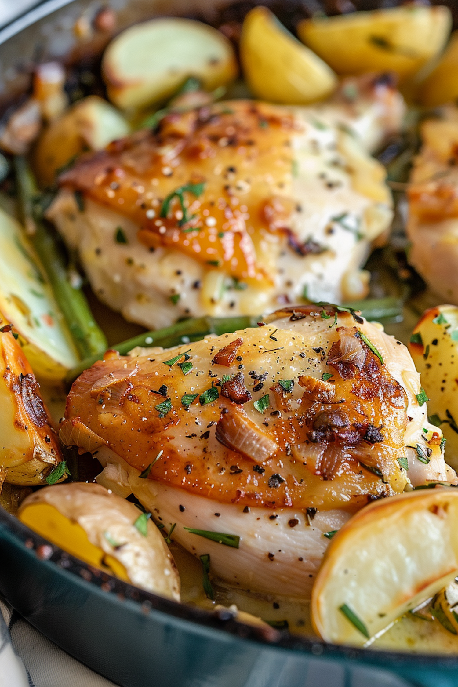 Golden roasted chicken with crispy skin, potatoes, green beans, and caramelized onions in a skillet, garnished with fresh herbs.