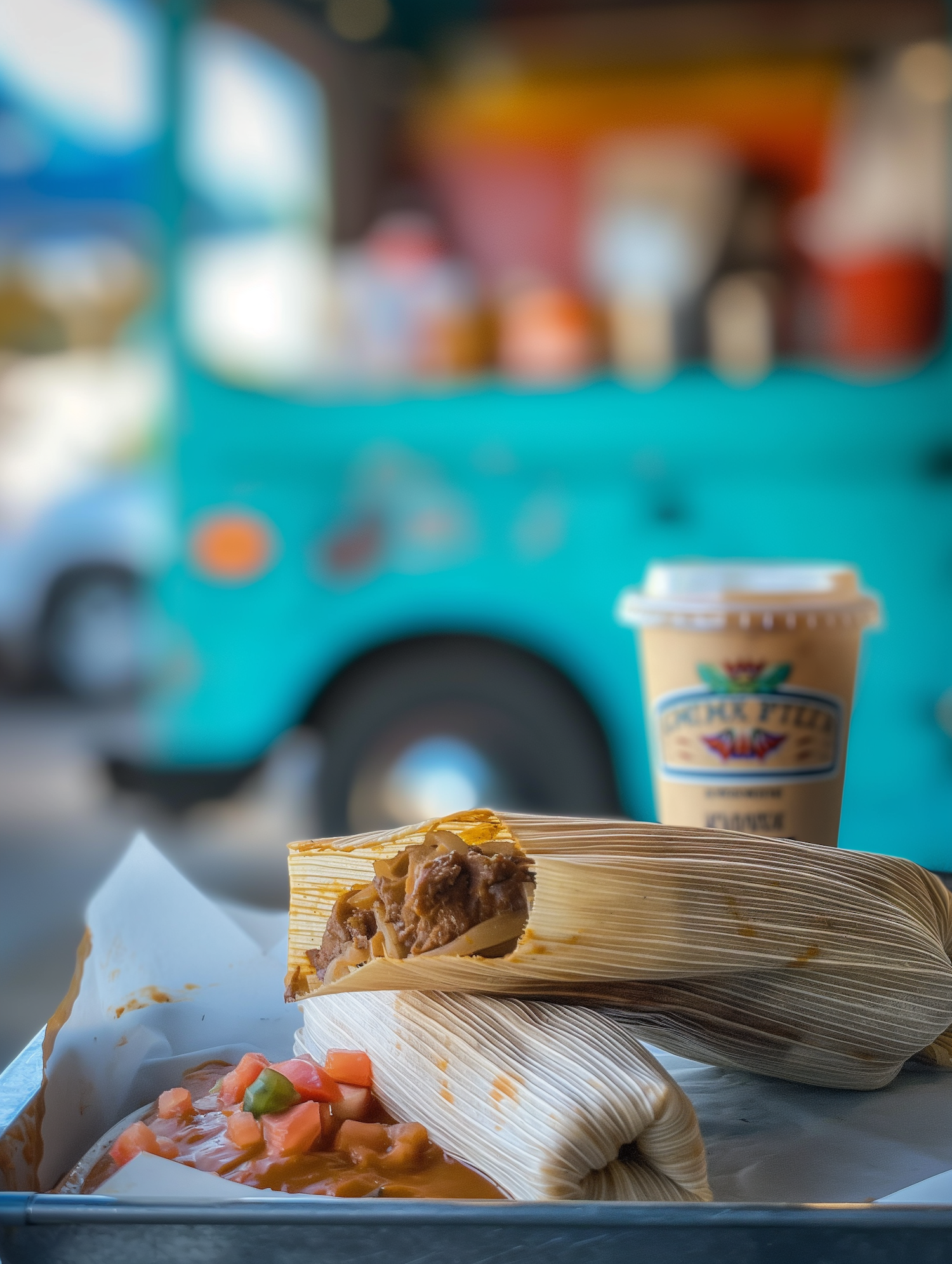 Close-up of a tamale with beans and coffee in front of a turquoise food truck, highlighting a casual dining scene.