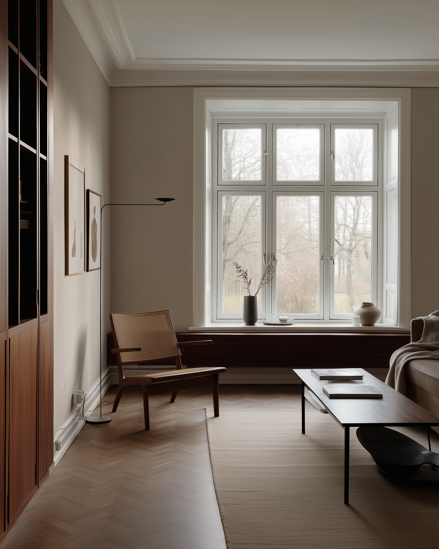Minimalist Scandinavian living room with a large window, cane chair, sleek coffee table, and warm wooden accents for a cozy, modern vibe.