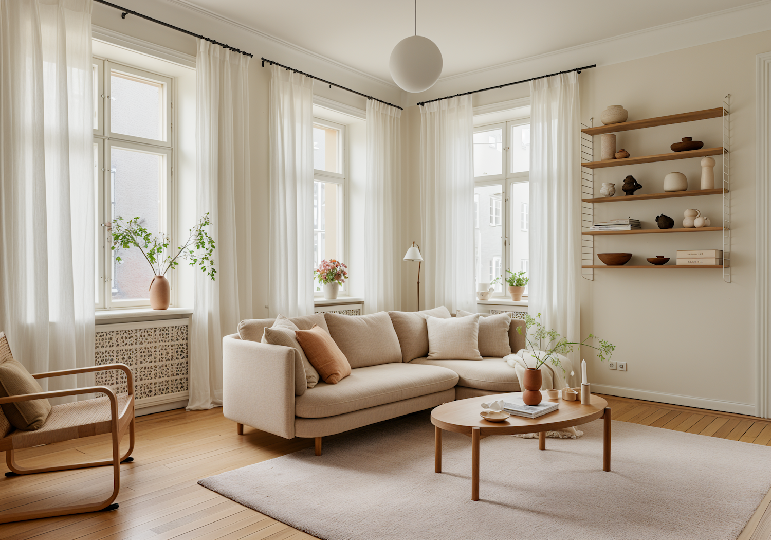 Bright and cozy Scandinavian-style living room with neutral tones, a beige sofa, wooden furniture, and natural light from large windows.