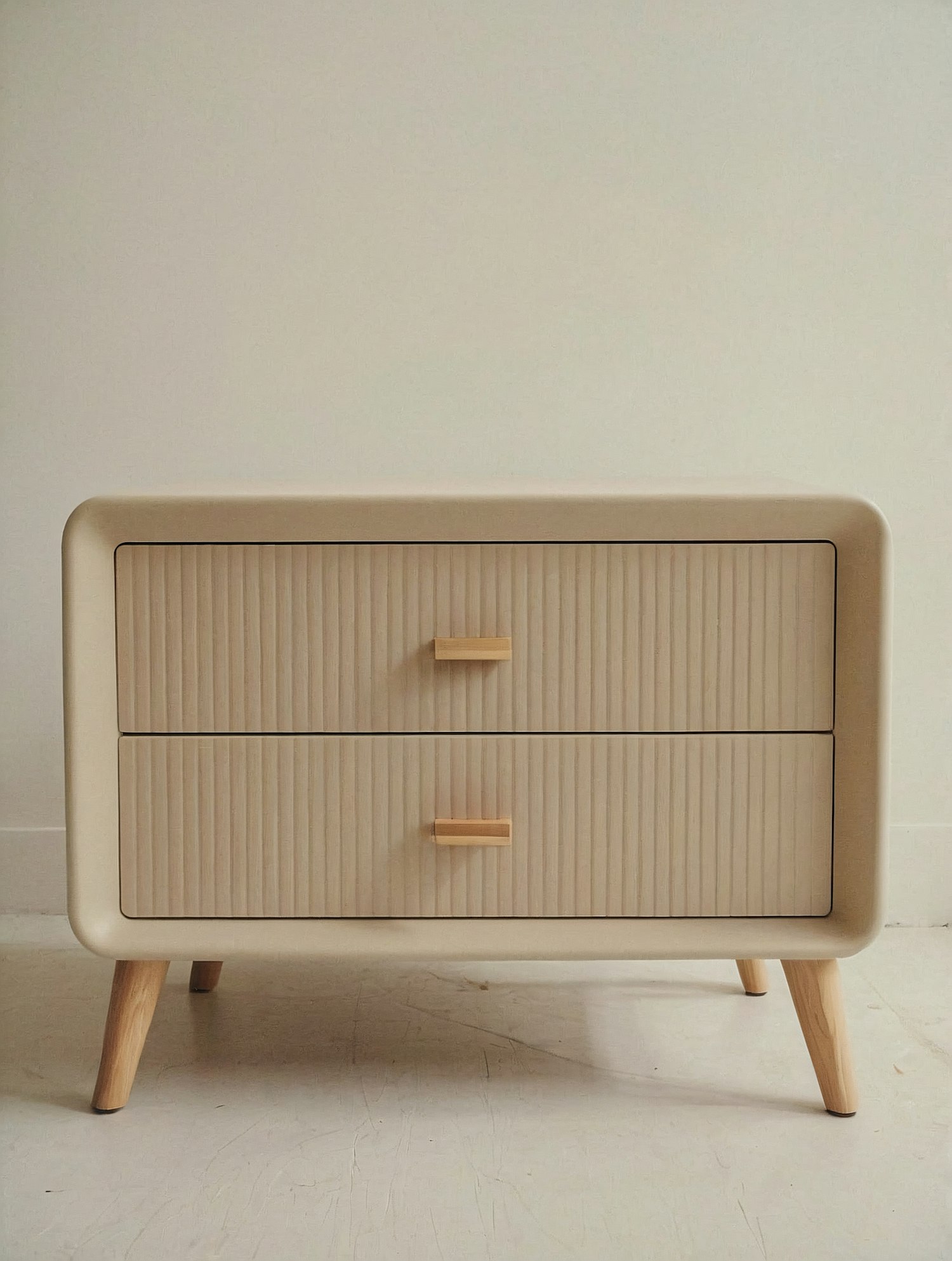 Minimalist beige nightstand with grooved drawers, light wood handles, and tapered legs, perfect for Scandinavian-style interiors.