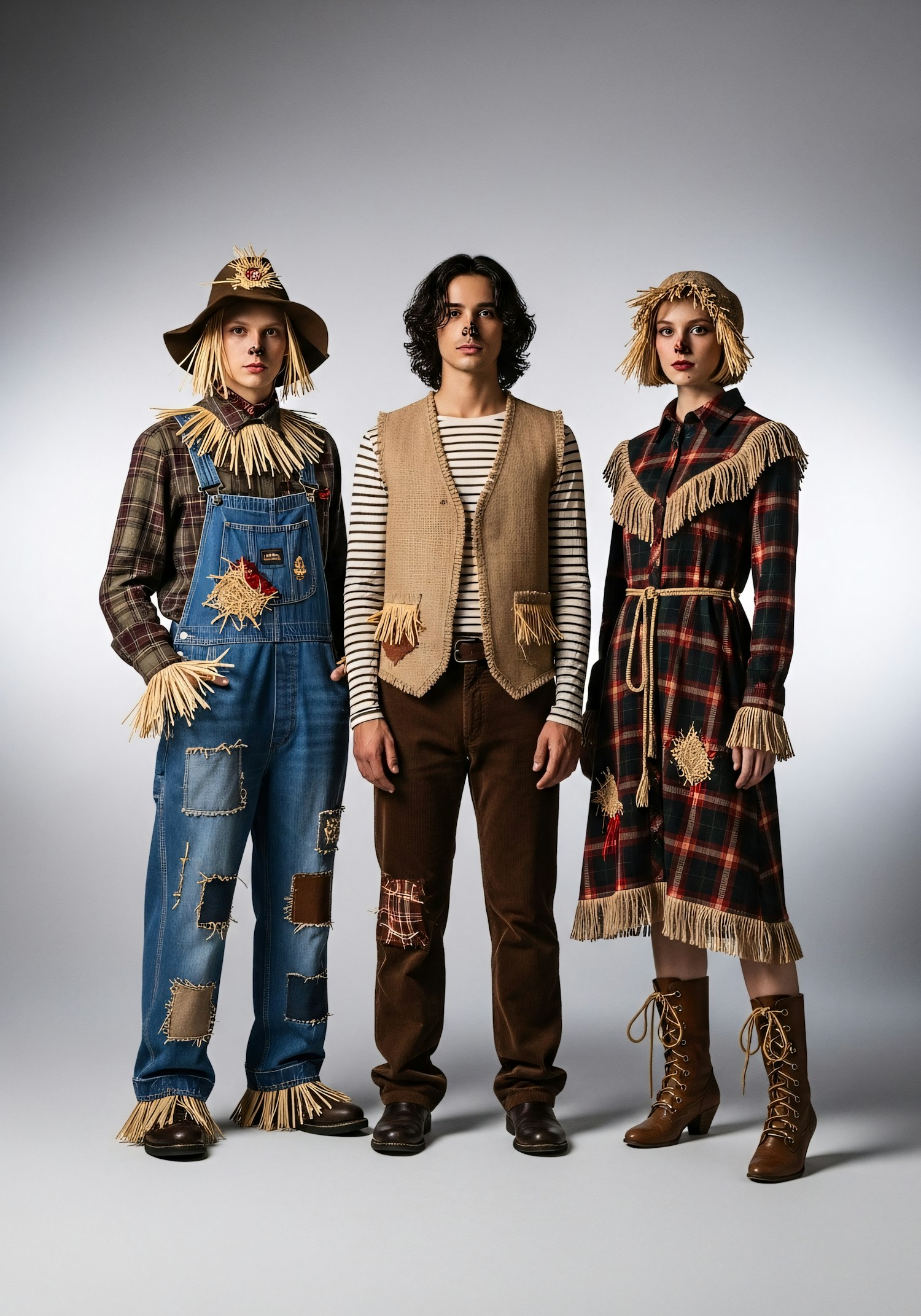 Three individuals in scarecrow-themed costumes with plaid, straw accents, and creative details, standing against a neutral background.