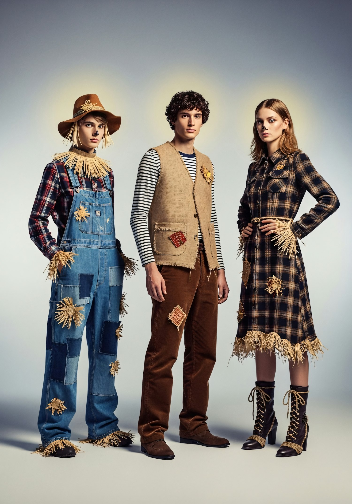 Three individuals in scarecrow-inspired outfits with straw accents and patchwork details, standing against a neutral background.