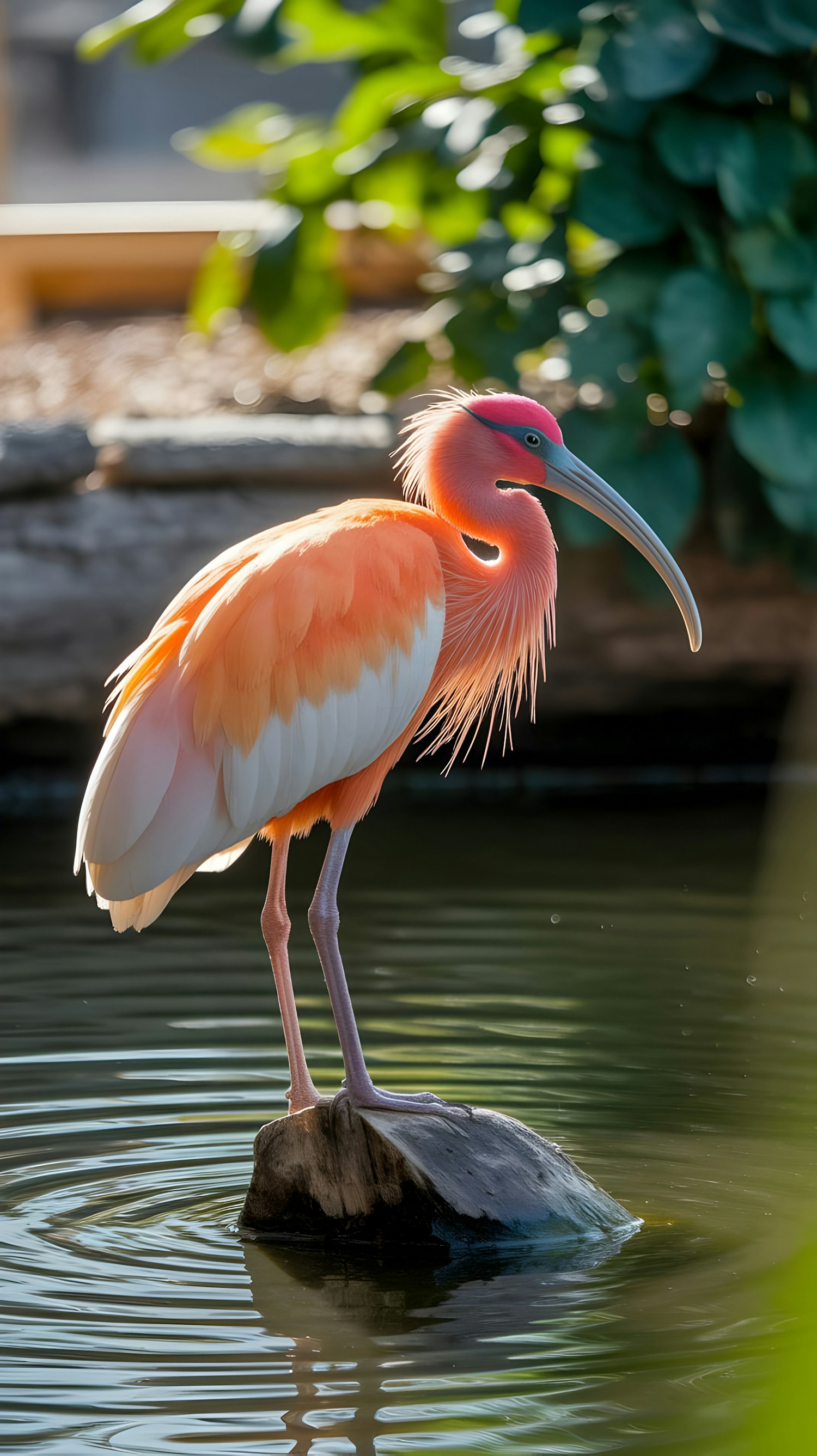 A scarlet ibis with vivid red-orange plumage stands on a rock in a serene pond, surrounded by lush greenery and soft sunlight.