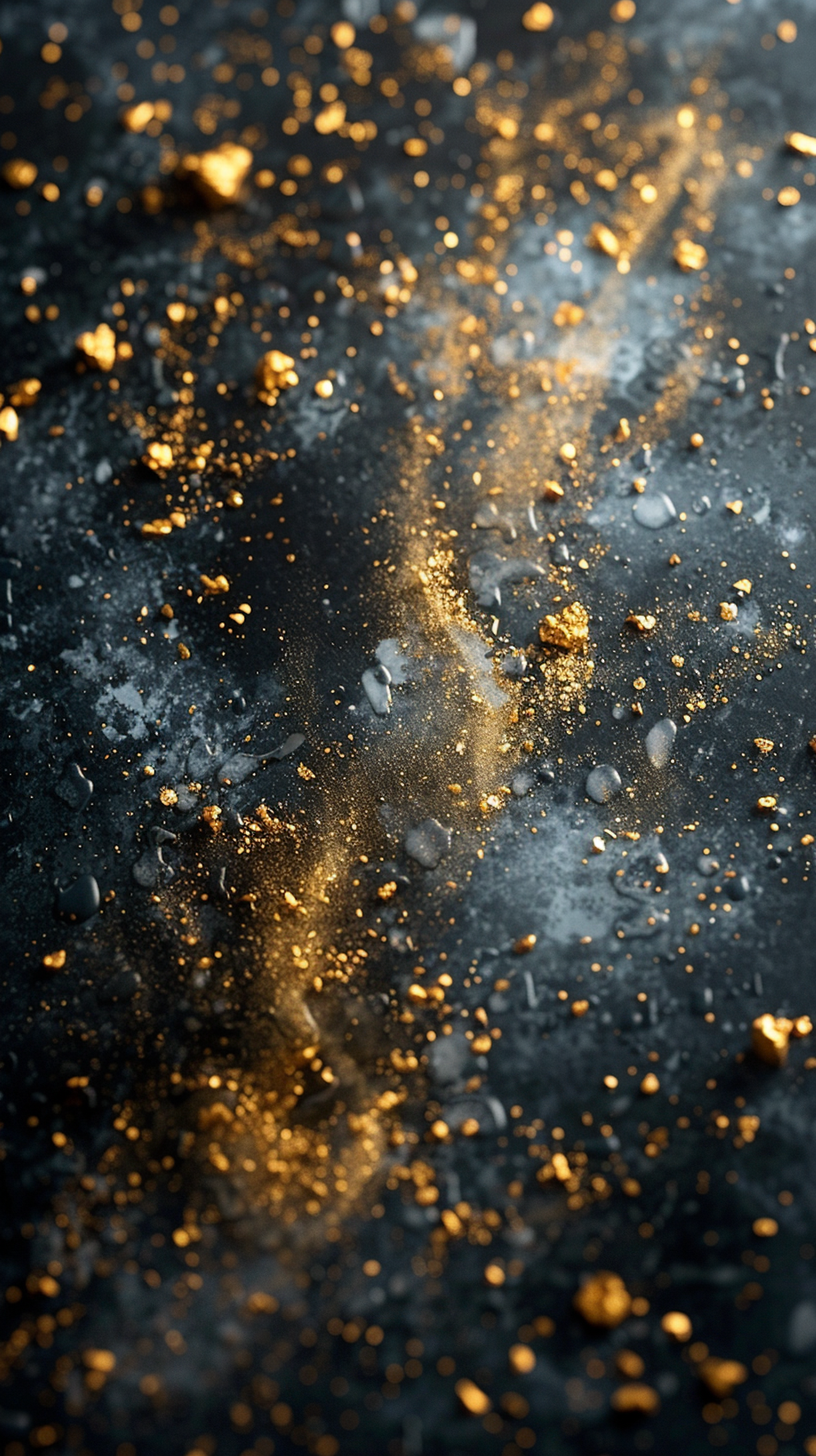 Abstract scene with golden particles on a dark background, creating a cosmic and luxurious effect with shimmering textures.