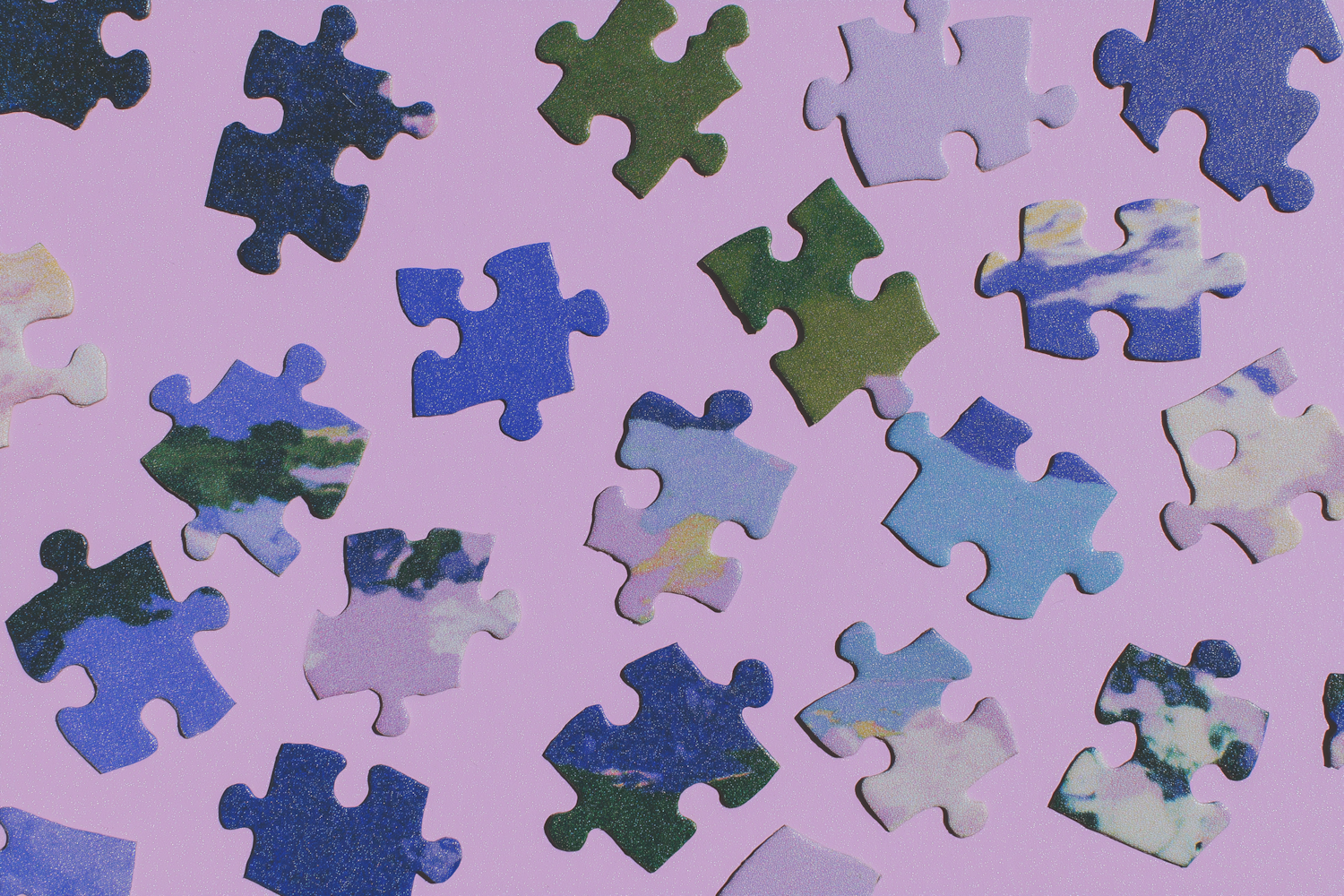 Vibrant puzzle pieces with blue, green, and nature-themed prints lie scattered on a pastel pink background.