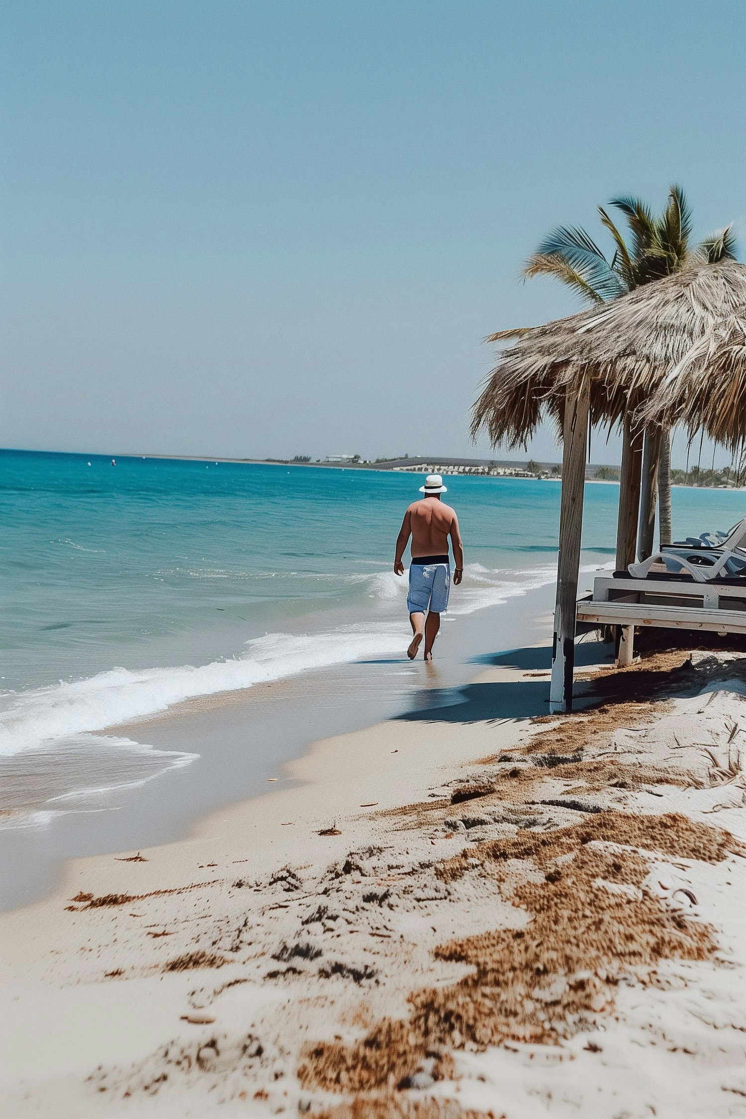 Man walking on a tropical beach with turquoise waters, wearing a white hat and shorts, near a thatched hut and palm trees.